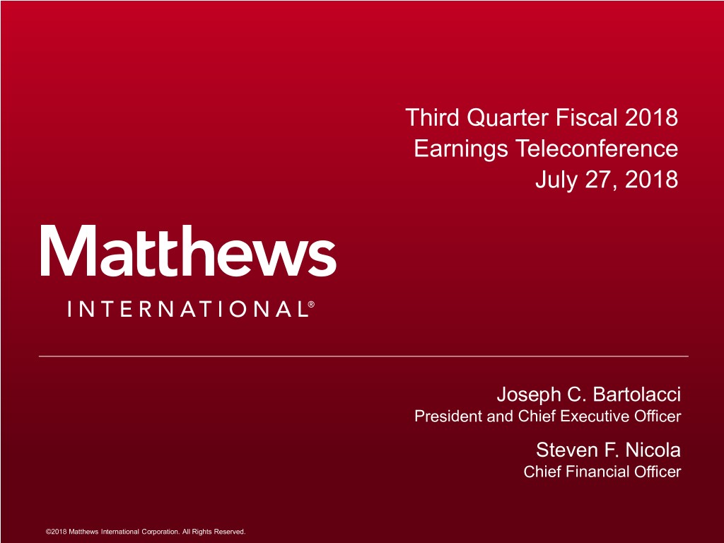 Third Quarter Fiscal 2018 Earnings Teleconference July 27, 2018 Joseph C. Bartolacci President and Chief Executive Officer Steven F. Nicola Chief Financial Officer ©2018 Matthews International Corporation. All Rights Reserved.