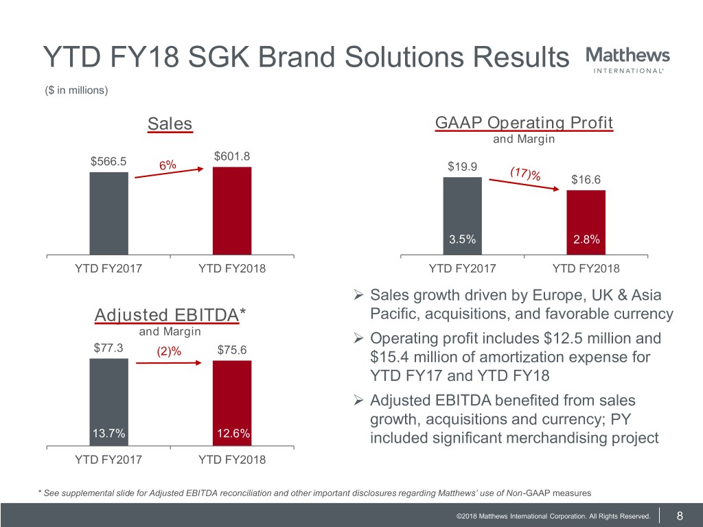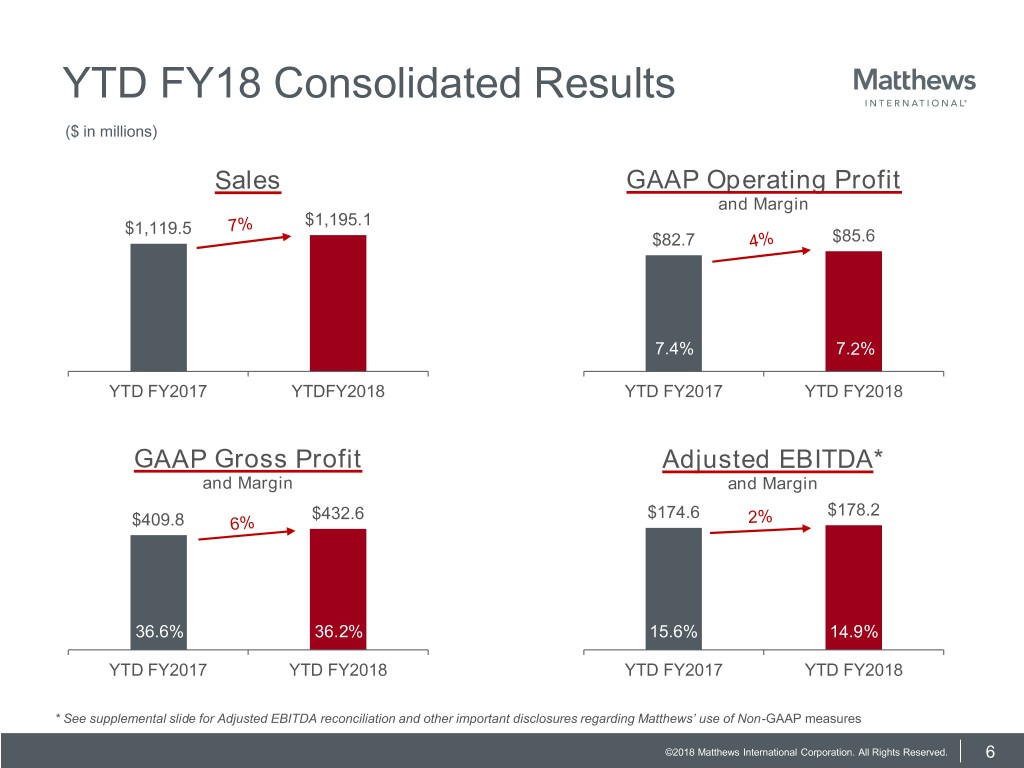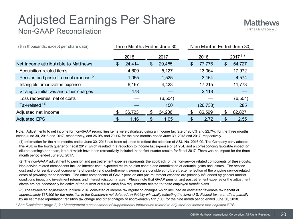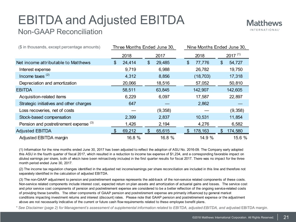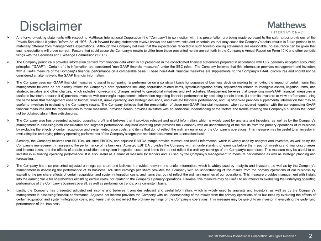 Disclaimer Any forward-looking statements with respect to Matthews International Corporation (the “Company”) in connection with this presentation are being made pursuant to the safe harbor provisions of the Private Securities Litigation Reform Act of 1995. Such forward-looking statements involve known and unknown risks and uncertainties that may cause the Company’s actual results in future periods to be materially different from management’s expectations. Although the Company believes that the expectations reflected in such forward-looking statements are reasonable, no assurance can be given that such expectations will prove correct. Factors that could cause the Company’s results to differ from those presented herein are set forth in the Company’s Annual Report on Form 10-K and other periodic filings with the Securities and Exchange Commission (“SEC”). The Company periodically provides information derived from financial data which is not presented in the consolidated financial statements prepared in accordance with U.S. generally accepted accounting principles (“GAAP”). Certain of this information are considered “non-GAAP financial measures” under the SEC rules. The Company believes that this information provides management and investors with a useful measure of the Company’s financial performance on a comparable basis. These non-GAAP financial measures are supplemental to the Company’s GAAP disclosures and should not be considered an alternative to the GAAP financial information. The Company uses non-GAAP financial measures to assist in comparing its performance on a consistent basis for purposes of business decision making by removing the impact of certain items that management believes do not directly reflect the Company’s core operations including acquisition-related items, system-integration costs, adjustments related to intangible assets, litigation items, and strategic initiative and other charges, which includes non-recurring charges related to operational initiatives and exit activities. Management believes that presenting non-GAAP financial measures is useful to investors because it (i) provides investors with meaningful supplemental information regarding financial performance by excluding certain items, (ii) permits investors to view performance using the same tools that management uses to budget, forecast, make operating and strategic decisions, and evaluate historical performance, and (iii) otherwise provides supplemental information that may be useful to investors in evaluating the Company’s results. The Company believes that the presentation of these non-GAAP financial measures, when considered together with the corresponding GAAP financial measures and the reconciliations to those measures, provided herein, provides investors with an additional understanding of the factors and trends affecting the Company’s business that could not be obtained absent these disclosures. The Company also has presented adjusted operating profit and believes that it provides relevant and useful information, which is widely used by analysts and investors, as well as by the Company’s management in assessing both consolidated and segment performance. Adjusted operating profit provides the Company with an understanding of the results from the primary operations of its business by excluding the effects of certain acquisition and system-integration costs, and items that do not reflect the ordinary earnings of the Company’s operations. This measure may be useful to an investor in evaluating the underlying primary operating performance of the Company’s segments and business overall on a consistent basis. Similarly, the Company believes that EBITDA, adjusted EBITDA, and adjusted EBITDA margin provide relevant and useful information, which is widely used by analysts and investors, as well as by the Company’s management in assessing the performance of its business. Adjusted EBITDA provides the Company with an understanding of earnings before the impact of investing and financing charges and income taxes, and the effects of certain acquisition and system-integration costs, and items that do not reflect the ordinary earnings of the Company’s operations. This measure may be useful to an investor in evaluating operating performance. It is also useful as a financial measure for lenders and is used by the Company’s management to measure performance as well as strategic planning and forecasting. The Company has also presented adjusted earnings per share and believes it provides relevant and useful information, which is widely used by analysts and investors, as well as by the Company’s management in assessing the performance of its business. Adjusted earnings per share provides the Company with an understanding of the results from the primary operations of our business by excluding the per share effects of certain acquisition and system-integration costs, and items that do not reflect the ordinary earnings of our operations. This measure provides management with insight into the earning value for shareholders excluding certain costs, not related to the Company’s primary operations. Likewise, this measure may be useful to an investor in evaluating the underlying operating performance of the Company’s business overall, as well as performance trends, on a consistent basis. Lastly, the Company has presented adjusted net income and believes it provides relevant and useful information, which is widely used by analysts and investors, as well as by the Company’s management in assessing financial performance. Adjusted net income provides the Company with an understanding of the results from the primary operations of its business by excluding the effects of certain acquisition and system-integration costs, and items that do not reflect the ordinary earnings of the Company’s operations. This measure may be useful to an investor in evaluating the underlying performance