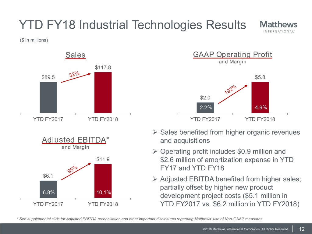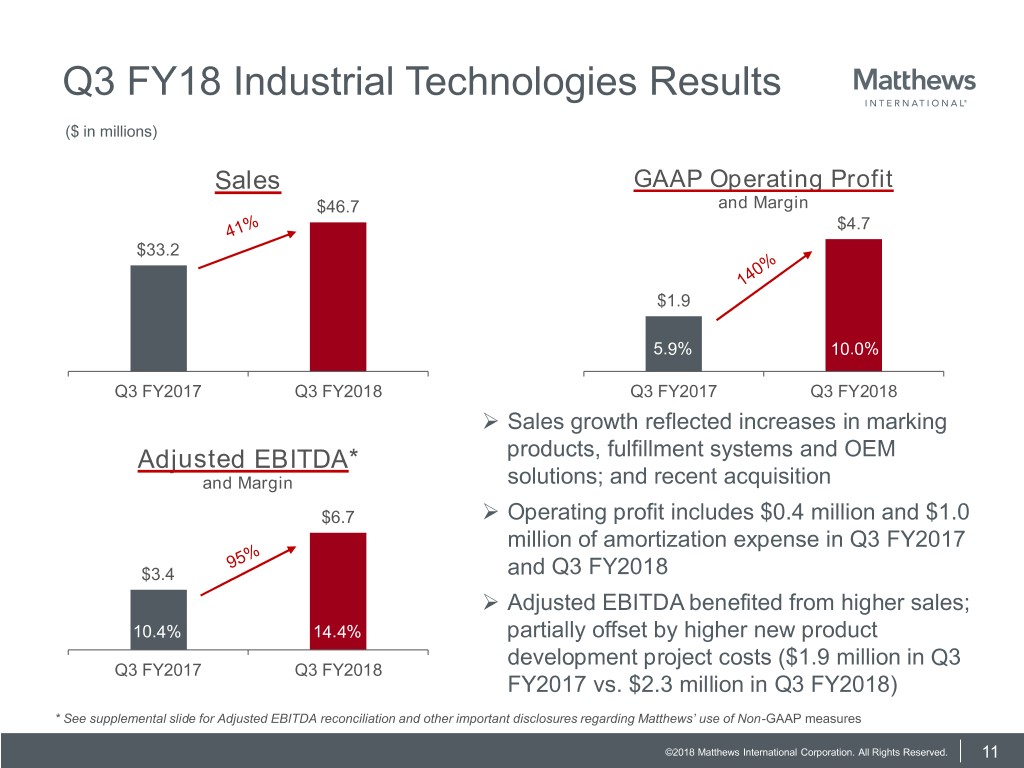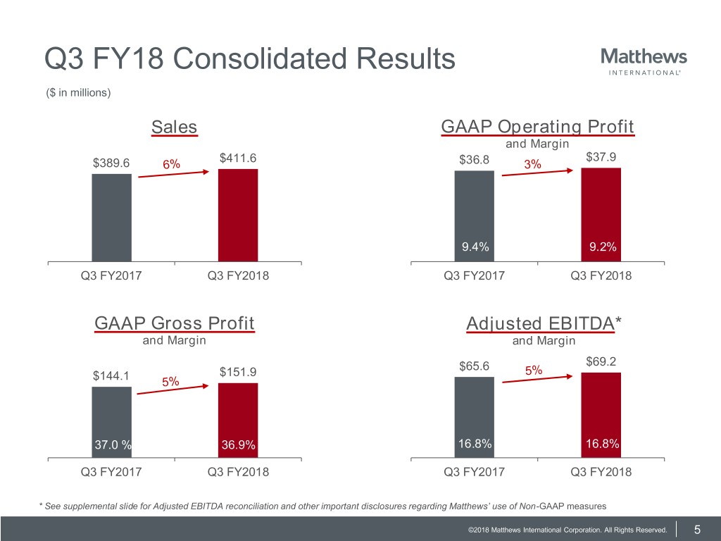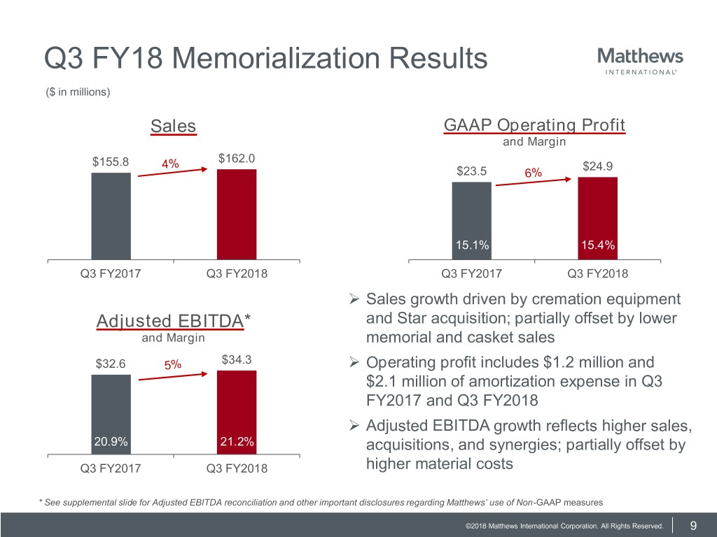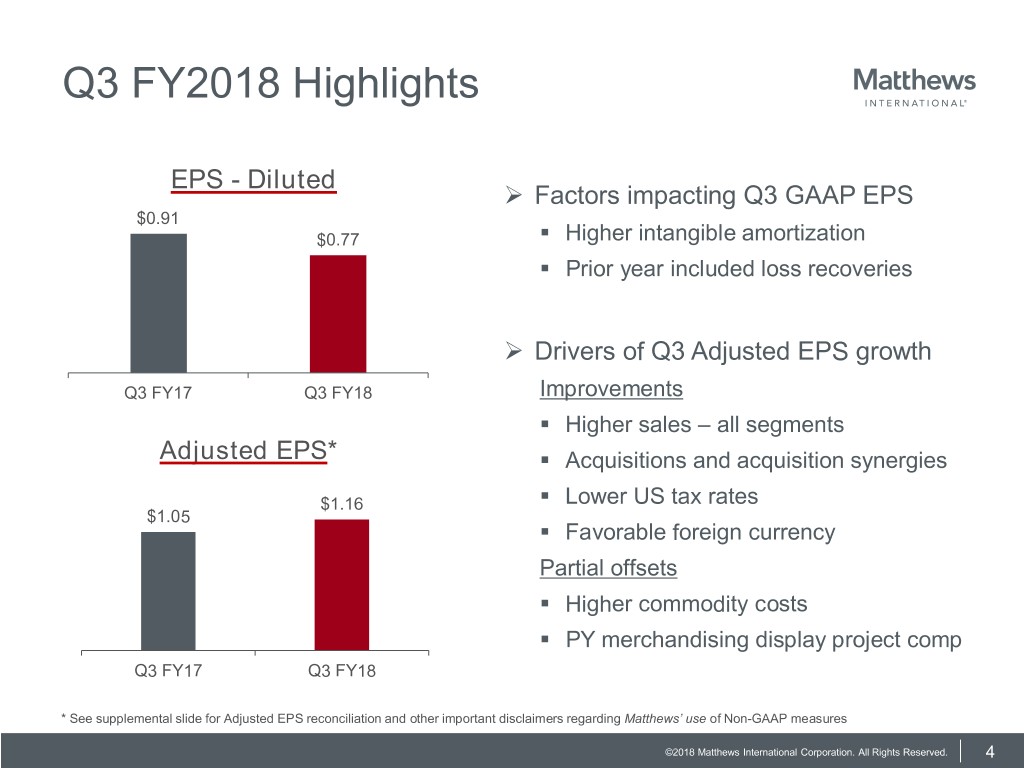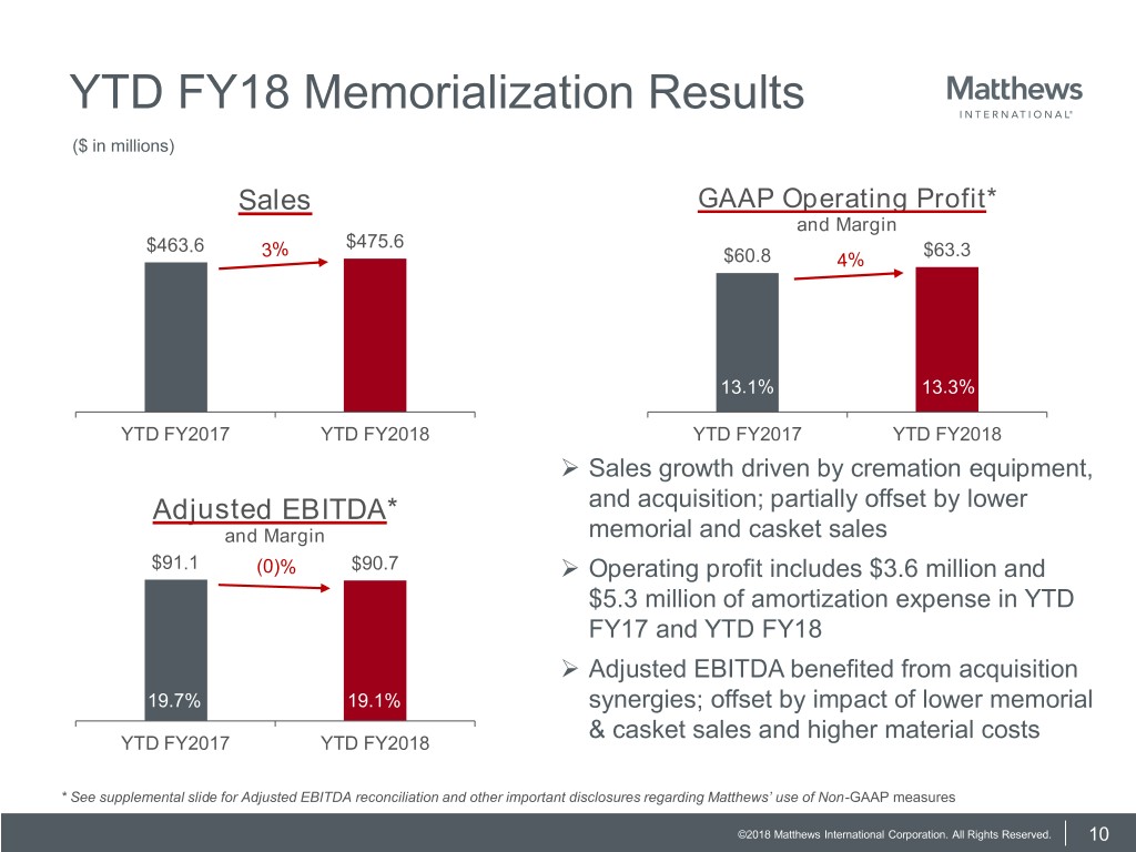 Disclaimer Any forward-looking statements with respect to Matthews International Corporation (the “Company”) in connection with this presentation are being made pursuant to the safe harbor provisions of the Private Securities Litigation Reform Act of 1995. Such forward-looking statements involve known and unknown risks and uncertainties that may cause the Company’s actual results in future periods to be materially different from management’s expectations. Although the Company believes that the expectations reflected in such forward-looking statements are reasonable, no assurance can be given that such expectations will prove correct. Factors that could cause the Company’s results to differ from those presented herein are set forth in the Company’s Annual Report on Form 10-K and other periodic filings with the Securities and Exchange Commission (“SEC”). The Company periodically provides information derived from financial data which is not presented in the consolidated financial statements prepared in accordance with U.S. generally accepted accounting principles (“GAAP”). Certain of this information are considered “non-GAAP financial measures” under the SEC rules. The Company believes that this information provides management and investors with a useful measure of the Company’s financial performance on a comparable basis. These non-GAAP financial measures are supplemental to the Company’s GAAP disclosures and should not be considered an alternative to the GAAP financial information. The Company uses non-GAAP financial measures to assist in comparing its performance on a consistent basis for purposes of business decision making by removing the impact of certain items that management believes do not directly reflect the Company’s core operations including acquisition-related items, system-integration costs, adjustments related to intangible assets, litigation items, and strategic initiative and other charges, which includes non-recurring charges related to operational initiatives and exit activities. Management believes that presenting non-GAAP financial measures is useful to investors because it (i) provides investors with meaningful supplemental information regarding financial performance by excluding certain items, (ii) permits investors to view performance using the same tools that management uses to budget, forecast, make operating and strategic decisions, and evaluate historical performance, and (iii) otherwise provides supplemental information that may be useful to investors in evaluating the Company’s results. The Company believes that the presentation of these non-GAAP financial measures, when considered together with the corresponding GAAP financial measures and the reconciliations to those measures, provided herein, provides investors with an additional understanding of the factors and trends affecting the Company’s business that could not be obtained absent these disclosures. The Company also has presented adjusted operating profit and believes that it provides relevant and useful information, which is widely used by analysts and investors, as well as by the Company’s management in assessing both consolidated and segment performance. Adjusted operating profit provides the Company with an understanding of the results from the primary operations of its business by excluding the effects of certain acquisition and system-integration costs, and items that do not reflect the ordinary earnings of the Company’s operations. This measure may be useful to an investor in evaluating the underlying primary operating performance of the Company’s segments and business overall on a consistent basis. Similarly, the Company believes that EBITDA, adjusted EBITDA, and adjusted EBITDA margin provide relevant and useful information, which is widely used by analysts and investors, as well as by the Company’s management in assessing the performance of its business. Adjusted EBITDA provides the Company with an understanding of earnings before the impact of investing and financing charges and income taxes, and the effects of certain acquisition and system-integration costs, and items that do not reflect the ordinary earnings of the Company’s operations. This measure may be useful to an investor in evaluating operating performance. It is also useful as a financial measure for lenders and is used by the Company’s management to measure performance as well as strategic planning and forecasting. The Company has also presented adjusted earnings per share and believes it provides relevant and useful information, which is widely used by analysts and investors, as well as by the Company’s management in assessing the performance of its business. Adjusted earnings per share provides the Company with an understanding of the results from the primary operations of our business by excluding the per share effects of certain acquisition and system-integration costs, and items that do not reflect the ordinary earnings of our operations. This measure provides management with insight into the earning value for shareholders excluding certain costs, not related to the Company’s primary operations. Likewise, this measure may be useful to an investor in evaluating the underlying operating performance of the Company’s business overall, as well as performance trends, on a consistent basis. Lastly, the Company has presented adjusted net income and believes it provides relevant and useful information, which is widely used by analysts and investors, as well as by the Company’s management in assessing financial performance. Adjusted net income provides the Company with an understanding of the results from the primary operations of its business by excluding the effects of certain acquisition and system-integration costs, and items that do not reflect the ordinary earnings of the Company’s operations. This measure may be useful to an investor in evaluating the underlying performance