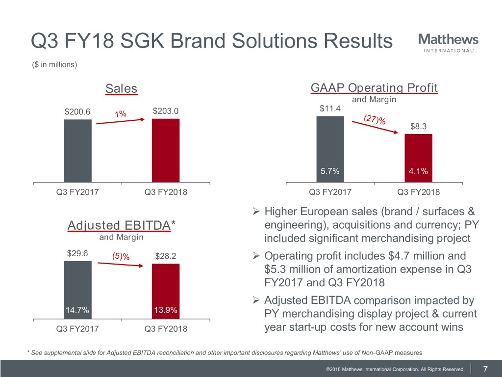 YTD FY18 Consolidated Results ($ in millions) Sales GAAP Operating Profit and Margin $1,195.1 $1,119.5 $82.7 $85.6 7.4% 7.2% YTD FY2017 YTDFY2018 YTD FY2017 YTD FY2018 GAAP Gross Profit Adjusted EBITDA* and Margin and Margin $178.2 $409.8 $432.6 $174.6 36.6% 36.2% 15.6% 14.9% YTD FY2017 YTD FY2018 YTD FY2017 YTD FY2018 * See supplemental slide for Adjusted EBITDA reconciliation and other important disclosures regarding Matthews’ use of Non-GAAP measures ©2018 Matthews International Corporation. All Rights Reserved. 6