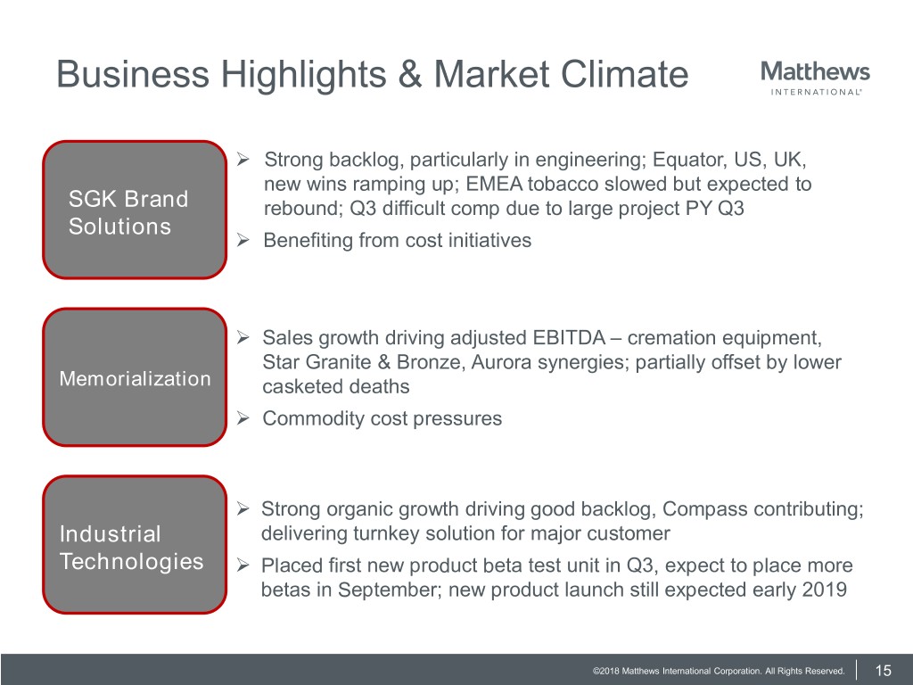 Business Overview ©2018 Matthews International Corporation. All Rights Reserved. 14