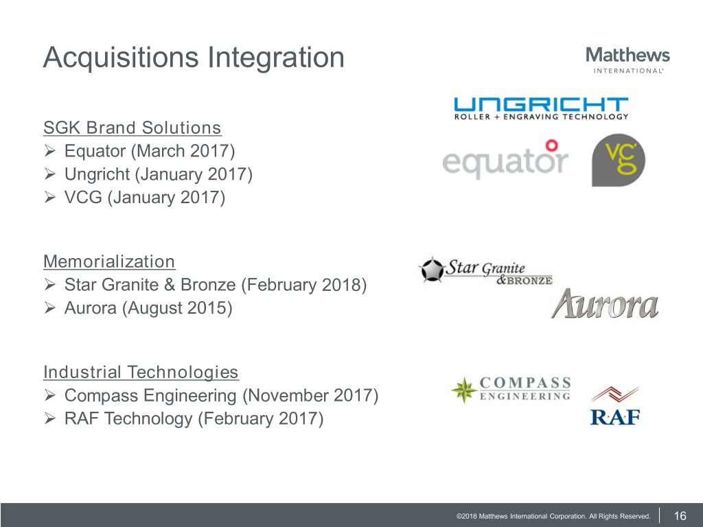 Acquisitions Integration SGK Brand Solutions Equator (March 2017) Ungricht (January 2017) VCG (January 2017) Memorialization Star Granite & Bronze (February 2018) Aurora (August 2015) Industrial Technologies Compass Engineering (November 2017) RAF Technology (February 2017) ©2018 Matthews International Corporation. All Rights Reserved. 16
