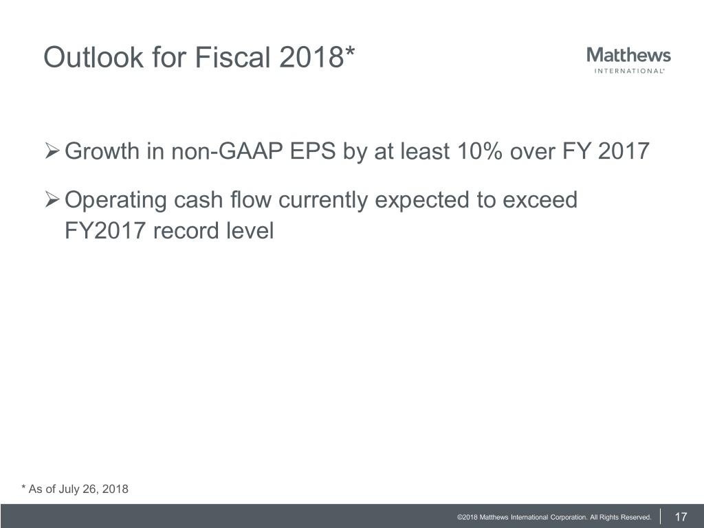 Outlook for Fiscal 2018* Growth in non-GAAP EPS by at least 10% over FY 2017 Operating cash flow currently expected to exceed FY2017 record level * As of July 26, 2018 ©2018 Matthews International Corporation. All Rights Reserved. 17