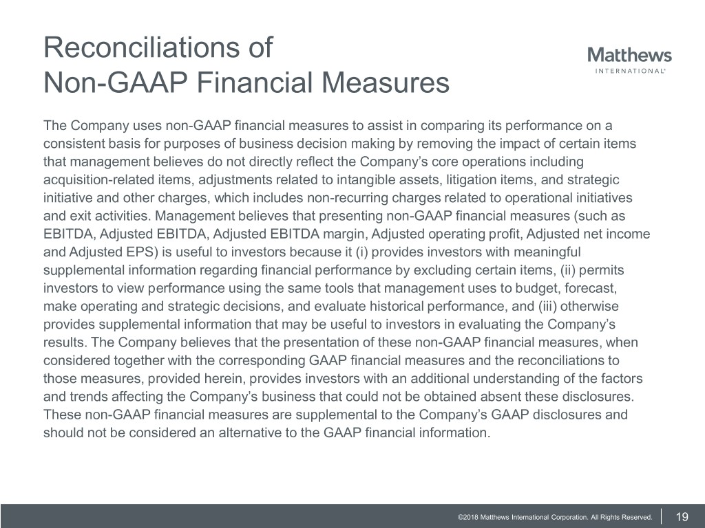 Reconciliations of Non-GAAP Financial Measures The Company uses non-GAAP financial measures to assist in comparing its performance on a consistent basis for purposes of business decision making by removing the impact of certain items that management believes do not directly reflect the Company’s core operations including acquisition-related items, adjustments related to intangible assets, litigation items, and strategic initiative and other charges, which includes non-recurring charges related to operational initiatives and exit activities. Management believes that presenting non-GAAP financial measures (such as EBITDA, Adjusted EBITDA, Adjusted EBITDA margin, Adjusted operating profit, Adjusted net income and Adjusted EPS) is useful to investors because it (i) provides investors with meaningful supplemental information regarding financial performance by excluding certain items, (ii) permits investors to view performance using the same tools that management uses to budget, forecast, make operating and strategic decisions, and evaluate historical performance, and (iii) otherwise provides supplemental information that may be useful to investors in evaluating the Company’s results. The Company believes that the presentation of these non-GAAP financial measures, when considered together with the corresponding GAAP financial measures and the reconciliations to those measures, provided herein, provides investors with an additional understanding of the factors and trends affecting the Company’s business that could not be obtained absent these disclosures. These non-GAAP financial measures are supplemental to the Company’s GAAP disclosures and should not be considered an alternative to the GAAP financial information. ©2018 Matthews International Corporation. All Rights Reserved. 19