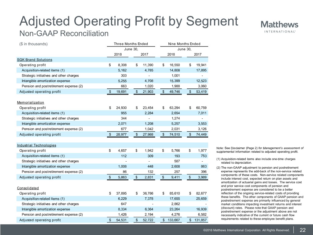 EBITDA and Adjusted EBITDA Non-GAAP Reconciliation ($ in thousands, except percentage amounts) Three Months Ended June 30, Nine Months Ended June 30, 2018 2017 2018 2017 (1) Net income attributable to Matthews $ 24,414 $ 29,485 $ 77,776 $ 54,727 Interest expense 9,719 6,988 26,782 19,750 Income taxes (2) 4,312 8,856 (18,703) 17,318 Depreciation and amortization 20,066 18,516 57,052 50,810 EBITDA 58,511 63,845 142,907 142,605 Acquisition-related items 6,229 6,097 17,587 22,897 Strategic initiatives and other charges 647 — 2,862 — Loss recoveries, net of costs — (9,358) — (9,358) Stock-based compensation 2,399 2,837 10,531 11,854 Pension and postretirement expense (3) 1,426 2,194 4,276 6,582 Adjusted EBITDA $ 69,212 $ 65,615 $ 178,163 $ 174,580 Adjusted EBITDA margin 16.8 % 16.8 % 14.9 % 15.6 % (1) Information for the nine months ended June 30, 2017 has been adjusted to reflect the adoption of ASU No. 2016-09. The Company early adopted this ASU in the fourth quarter of fiscal 2017, which resulted in a reduction to income tax expense of $1,234, and a corresponding favorable impact on diluted earnings per share, both of which have been retroactively included in the first quarter results for fiscal 2017. There was no impact for the three month period ended June 30, 2017. (2) The income tax regulation changes identified in the adjusted net income/earnings per share reconciliation are included in this line and therefore not separately identified in the calculation of adjusted EBITDA. (3) The non-GAAP adjustment to pension and postretirement expense represents the add-back of the non-service related components of these costs. Non-service related components include interest cost, expected return on plan assets and amortization of actuarial gains and losses. The service cost and prior service cost components of pension and postretirement expense are considered to be a better reflection of the ongoing service-related costs of providing these benefits. The other components of GAAP pension and postretirement expense are primarily influenced by general market conditions impacting investment returns and interest (discount) rates. Please note that GAAP pension and postretirement expense or the adjustment above are not necessarily indicative of the current or future cash flow requirements related to these employee benefit plans. * See Disclaimer (page 2) for Management’s assessment of supplemental information related to EBITDA, adjusted EBITDA, and adjusted EBITDA margin. ©2018 Matthews International Corporation. All Rights Reserved. 21