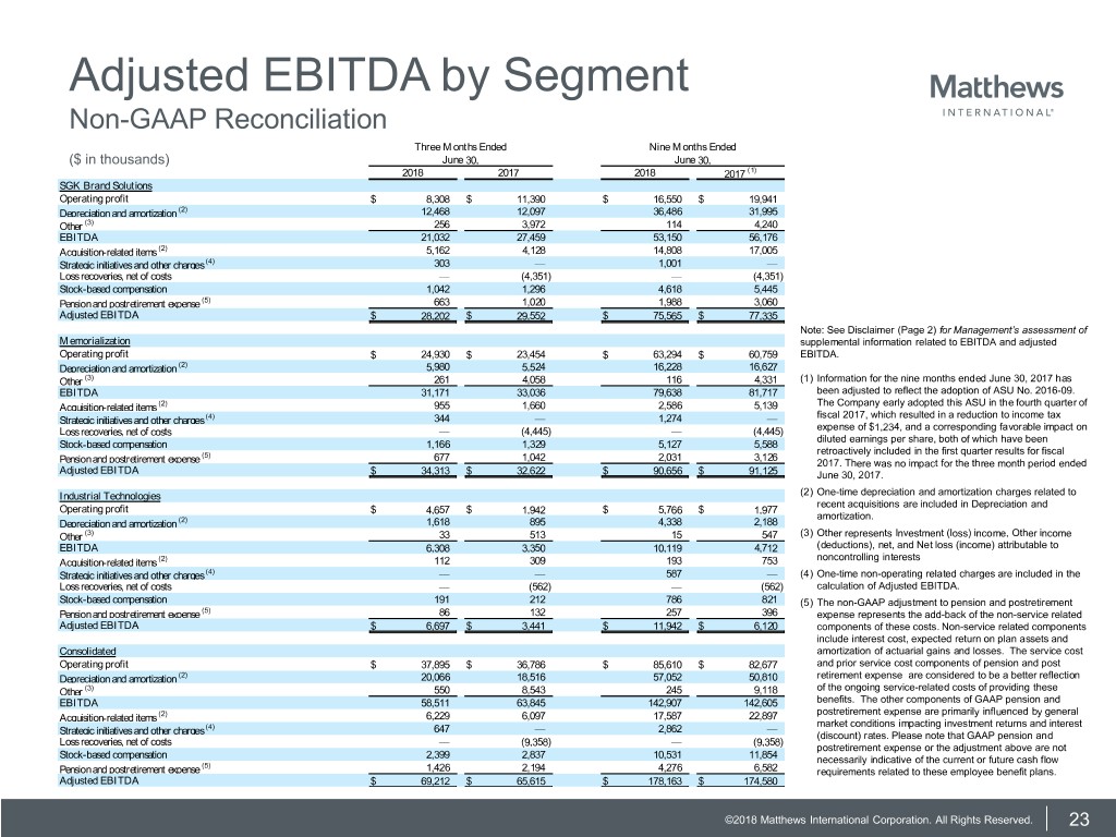 Adjusted Operating Profit by Segment Non-GAAP Reconciliation ($ in thousands) Three Months Ended Nine Months Ended June 30, June 30, 2018 2017 2018 2017 SGK Brand Solutions Operating profit $ 8,308 $ 11,390 $ 16,550 $ 19,941 Acquisition-related items (1) 5,162 4,785 14,808 17,895 Strategic initiatives and other charges 303 - 1,001 - Intangible amortization expense 5,255 4,708 15,399 12,523 Pension and postretirement expense (2) 663 1,020 1,988 3,060 Adjusted operating profit $ 19,691 $ 21,903 $ 49,746 $ 53,419 Memorialization Operating profit $ 24,930 $ 23,454 $ 63,294 $ 60,759 Acquisition-related items (1) 955 2,284 2,654 7,011 Strategic initiatives and other charges 344 - 1,274 - Intangible amortization expense 2,071 1,208 5,257 3,553 Pension and postretirement expense (2) 677 1,042 2,031 3,126 Adjusted operating profit $ 28,977 $ 27,988 $ 74,510 $ 74,449 Industrial Technologies Note: See Disclaimer (Page 2) for Management’s assessment of Operating profit $ 4,657 $ 1,942 $ 5,766 $ 1,977 supplemental information related to adjusted operating profit. Acquisition-related items (1) 112 309 193 753 (1) Acquisition-related items also include one-time charges Strategic initiatives and other charges - - 587 - related to depreciation. Intangible amortization expense 1,008 448 2,608 863 (2) The non-GAAP adjustment to pension and postretirement Pension and postretirement expense (2) 86 132 257 396 expense represents the add-back of the non-service related components of these costs. Non-service related components Adjusted operating profit $ 5,863 $ 2,831 $ 9,411 $ 3,989 include interest cost, expected return on plan assets and amortization of actuarial gains and losses. The service cost and prior service cost components of pension and Consolidated postretirement expense are considered to be a better Operating profit $ 37,895 $ 36,786 $ 85,610 $ 82,677 reflection of the ongoing service-related costs of providing these benefits. The other components of GAAP pension and Acquisition-related items (1) 6,229 7,378 17,655 25,659 postretirement expense are primarily influenced by general Strategic initiatives and other charges 647 - 2,862 - market conditions impacting investment returns and interest Intangible amortization expense 8,334 6,364 23,264 16,939 (discount) rates. Please note that GAAP pension and postretirement expense or the adjustment above are not Pension and postretirement expense (2) 1,426 2,194 4,276 6,582 necessarily indicative of the current or future cash flow Adjusted operating profit $ 54,531 $ 52,722 $ 133,667 $ 131,857 requirements related to these employee benefit plans. ©2018 Matthews International Corporation. All Rights Reserved. 22