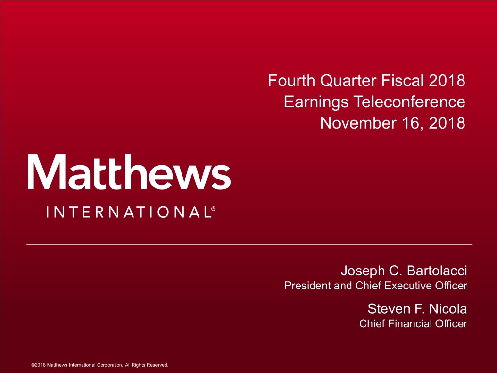 Fourth Quarter Fiscal 2018 Earnings Teleconference November 16, 2018 Joseph C. Bartolacci President and Chief Executive Officer Steven F. Nicola Chief Financial Officer ©2018 Matthews International Corporation. All Rights Reserved.
