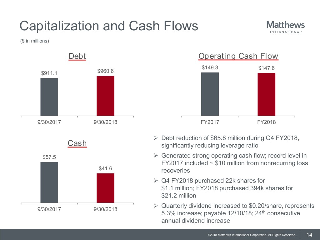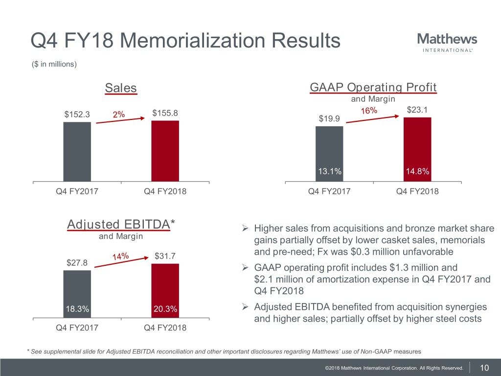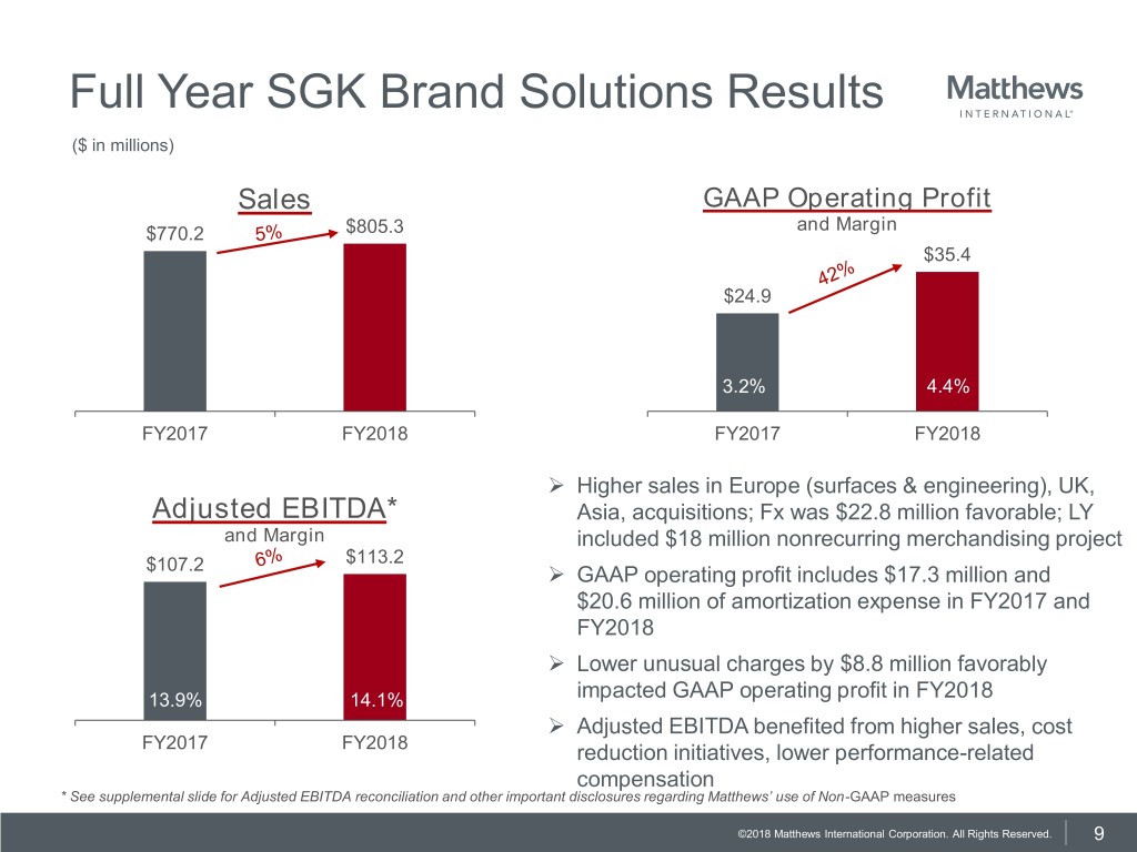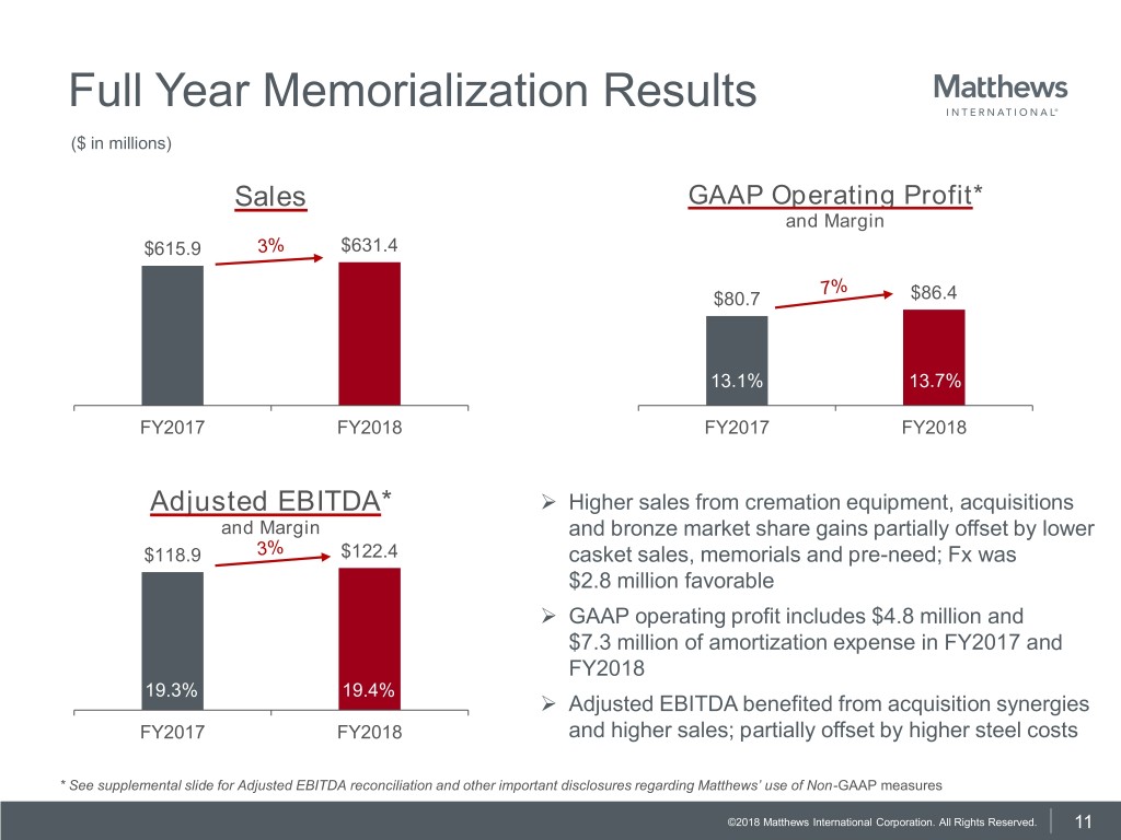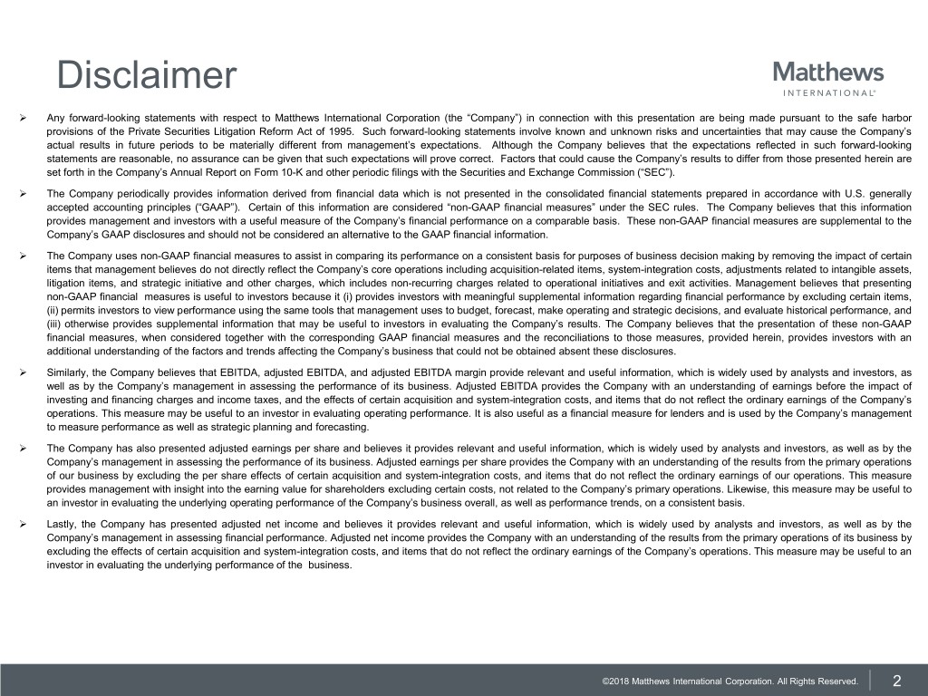 Disclaimer ➢ Any forward-looking statements with respect to Matthews International Corporation (the “Company”) in connection with this presentation are being made pursuant to the safe harbor provisions of the Private Securities Litigation Reform Act of 1995. Such forward-looking statements involve known and unknown risks and uncertainties that may cause the Company’s actual results in future periods to be materially different from management’s expectations. Although the Company believes that the expectations reflected in such forward-looking statements are reasonable, no assurance can be given that such expectations will prove correct. Factors that could cause the Company’s results to differ from those presented herein are set forth in the Company’s Annual Report on Form 10-K and other periodic filings with the Securities and Exchange Commission (“SEC”). ➢ The Company periodically provides information derived from financial data which is not presented in the consolidated financial statements prepared in accordance with U.S. generally accepted accounting principles (“GAAP”). Certain of this information are considered “non-GAAP financial measures” under the SEC rules. The Company believes that this information provides management and investors with a useful measure of the Company’s financial performance on a comparable basis. These non-GAAP financial measures are supplemental to the Company’s GAAP disclosures and should not be considered an alternative to the GAAP financial information. ➢ The Company uses non-GAAP financial measures to assist in comparing its performance on a consistent basis for purposes of business decision making by removing the impact of certain items that management believes do not directly reflect the Company’s core operations including acquisition-related items, system-integration costs, adjustments related to intangible assets, litigation items, and strategic initiative and other charges, which includes non-recurring charges related to operational initiatives and exit activities. Management believes that presenting non-GAAP financial measures is useful to investors because it (i) provides investors with meaningful supplemental information regarding financial performance by excluding certain items, (ii) permits investors to view performance using the same tools that management uses to budget, forecast, make operating and strategic decisions, and evaluate historical performance, and (iii) otherwise provides supplemental information that may be useful to investors in evaluating the Company’s results. The Company believes that the presentation of these non-GAAP financial measures, when considered together with the corresponding GAAP financial measures and the reconciliations to those measures, provided herein, provides investors with an additional understanding of the factors and trends affecting the Company’s business that could not be obtained absent these disclosures. ➢ Similarly, the Company believes that EBITDA, adjusted EBITDA, and adjusted EBITDA margin provide relevant and useful information, which is widely used by analysts and investors, as well as by the Company’s management in assessing the performance of its business. Adjusted EBITDA provides the Company with an understanding of earnings before the impact of investing and financing charges and income taxes, and the effects of certain acquisition and system-integration costs, and items that do not reflect the ordinary earnings of the Company’s operations. This measure may be useful to an investor in evaluating operating performance. It is also useful as a financial measure for lenders and is used by the Company’s management to measure performance as well as strategic planning and forecasting. ➢ The Company has also presented adjusted earnings per share and believes it provides relevant and useful information, which is widely used by analysts and investors, as well as by the Company’s management in assessing the performance of its business. Adjusted earnings per share provides the Company with an understanding of the results from the primary operations of our business by excluding the per share effects of certain acquisition and system-integration costs, and items that do not reflect the ordinary earnings of our operations. This measure provides management with insight into the earning value for shareholders excluding certain costs, not related to the Company’s primary operations. Likewise, this measure may be useful to an investor in evaluating the underlying operating performance of the Company’s business overall, as well as performance trends, on a consistent basis. ➢ Lastly, the Company has presented adjusted net income and believes it provides relevant and useful information, which is widely used by analysts and investors, as well as by the Company’s management in assessing financial performance. Adjusted net income provides the Company with an understanding of the results from the primary operations of its business by excluding the effects of certain acquisition and system-integration costs, and items that do not reflect the ordinary earnings of the Company’s operations. This measure may be useful to an investor in evaluating the underlying performance of the business. ©2018 Matthews International Corporation. All Rights Reserved. 2