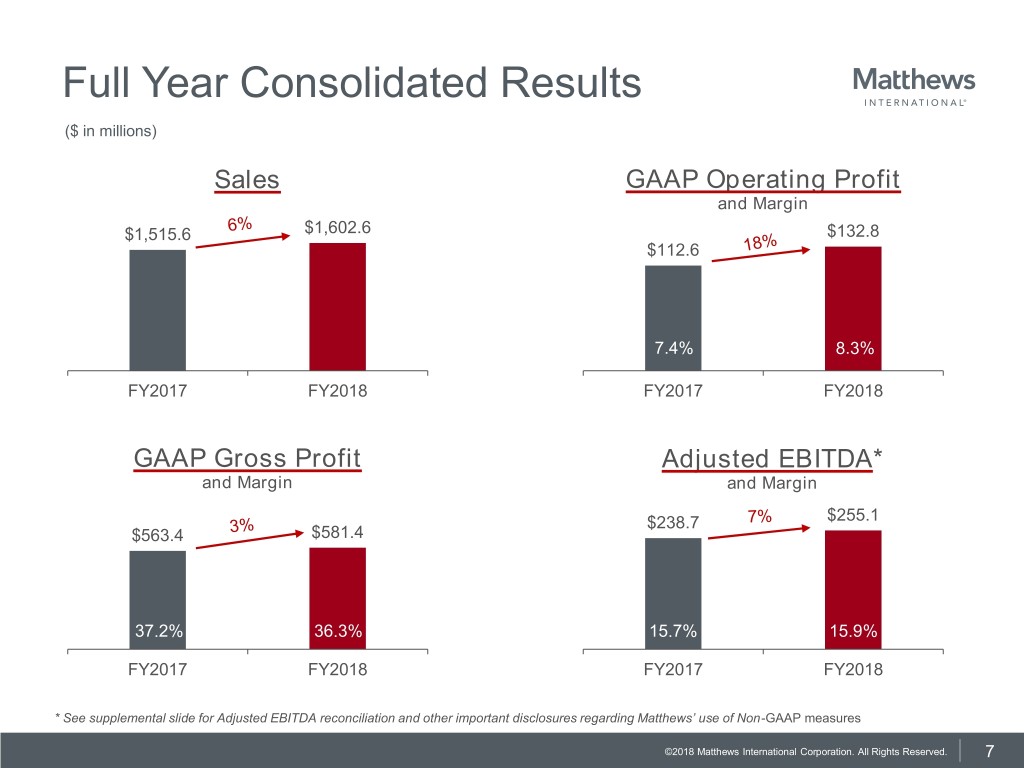 Q4 FY2018 Consolidated Results ($ in millions) Sales GAAP Operating Profit and Margin $396.1 $407.4 $47.2 $29.9 7.6% 11.6% Q4 FY2017 Q4 FY2018 Q4 FY2017 Q4 FY2018 GAAP Gross Profit Adjusted EBITDA* and Margin and Margin $153.6 $148.8 $77.0 $64.1 38.8 % 36.5% 16.2% 18.9% Q4 FY2017 Q4 FY2018 Q4 FY2017 Q4 FY2018 * See supplemental slide for Adjusted EBITDA reconciliation and other important disclosures regarding Matthews’ use of Non-GAAP measures ©2018 Matthews International Corporation. All Rights Reserved. 6
