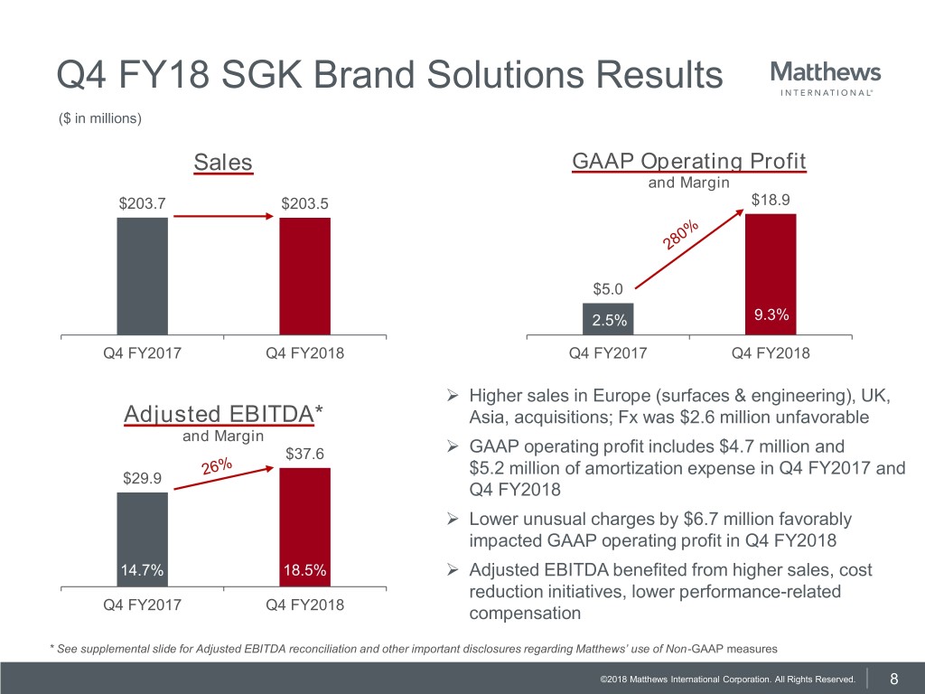 Full Year Consolidated Results ($ in millions) Sales GAAP Operating Profit and Margin $1,515.6 $1,602.6 $132.8 $112.6 7.4% 8.3% FY2017 FY2018 FY2017 FY2018 GAAP Gross Profit Adjusted EBITDA* and Margin and Margin $238.7 $255.1 $563.4 $581.4 37.2% 36.3% 15.7% 15.9% FY2017 FY2018 FY2017 FY2018 * See supplemental slide for Adjusted EBITDA reconciliation and other important disclosures regarding Matthews’ use of Non-GAAP measures ©2018 Matthews International Corporation. All Rights Reserved. 7
