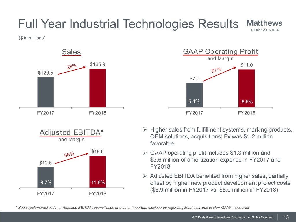 Q4 FY18 Industrial Technologies Results ($ in millions) Sales GAAP Operating Profit and Margin $48.1 6 $5.1 $5.3 $40.1 5 4 3 2 1 12.7% 11.0% 0 Q4 FY2017 Q4 FY2018 Q4 FY2017 Q4 FY2018 Adjusted EBITDA* ➢ Higher sales from fulfillment systems, marking products, and Margin OEM solutions, Compass Engineering acquisition; Fx was $0.5 million unfavorable $7.6 ➢ $6.5 GAAP operating profit includes $0.4 million and $1.0 million of amortization expense in Q4 FY2017 and Q4 FY2018 ➢ Adjusted EBITDA benefited from higher sales; each 16.2% 15.8% period includes $1.8 million of new product development Q4 FY2017 Q4 FY2018 project costs * See supplemental slide for Adjusted EBITDA reconciliation and other important disclosures regarding Matthews’ use of Non-GAAP measures ©2018 Matthews International Corporation. All Rights Reserved. 12