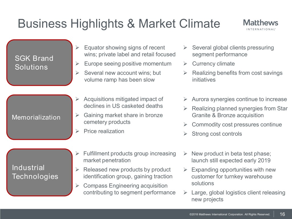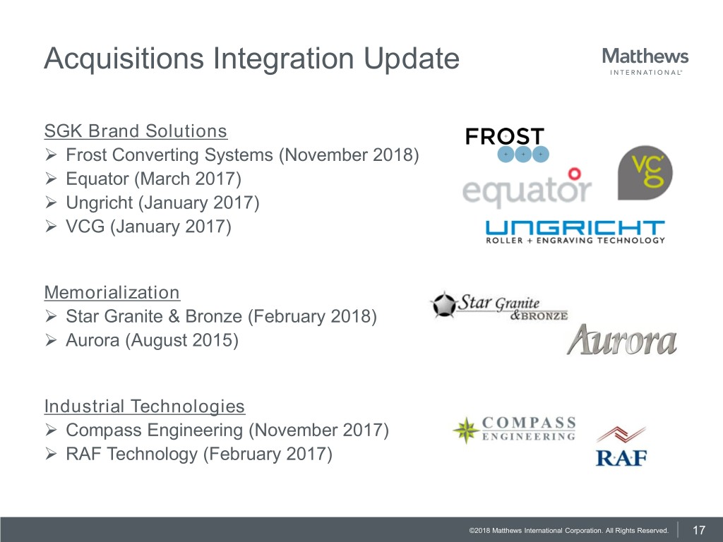 Acquisitions Integration Update SGK Brand Solutions ➢ Frost Converting Systems (November 2018) ➢ Equator (March 2017) ➢ Ungricht (January 2017) ➢ VCG (January 2017) Memorialization ➢ Star Granite & Bronze (February 2018) ➢ Aurora (August 2015) Industrial Technologies ➢ Compass Engineering (November 2017) ➢ RAF Technology (February 2017) ©2018 Matthews International Corporation. All Rights Reserved. 17