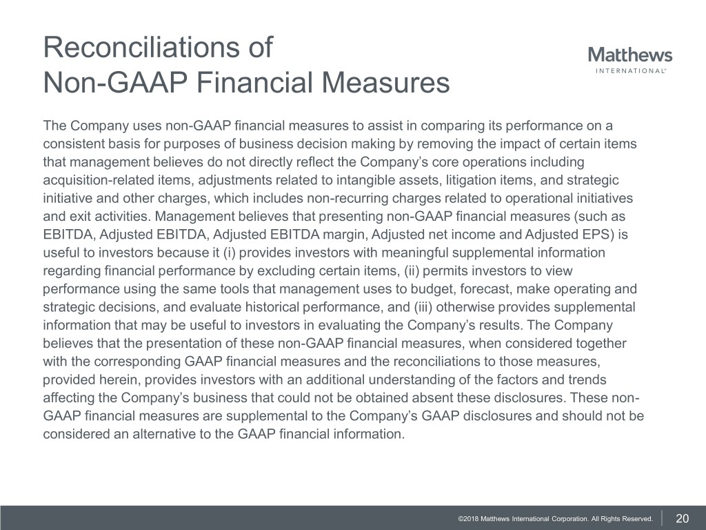 Reconciliations of Non-GAAP Financial Measures The Company uses non-GAAP financial measures to assist in comparing its performance on a consistent basis for purposes of business decision making by removing the impact of certain items that management believes do not directly reflect the Company’s core operations including acquisition-related items, adjustments related to intangible assets, litigation items, and strategic initiative and other charges, which includes non-recurring charges related to operational initiatives and exit activities. Management believes that presenting non-GAAP financial measures (such as EBITDA, Adjusted EBITDA, Adjusted EBITDA margin, Adjusted net income and Adjusted EPS) is useful to investors because it (i) provides investors with meaningful supplemental information regarding financial performance by excluding certain items, (ii) permits investors to view performance using the same tools that management uses to budget, forecast, make operating and strategic decisions, and evaluate historical performance, and (iii) otherwise provides supplemental information that may be useful to investors in evaluating the Company’s results. The Company believes that the presentation of these non-GAAP financial measures, when considered together with the corresponding GAAP financial measures and the reconciliations to those measures, provided herein, provides investors with an additional understanding of the factors and trends affecting the Company’s business that could not be obtained absent these disclosures. These non- GAAP financial measures are supplemental to the Company’s GAAP disclosures and should not be considered an alternative to the GAAP financial information. ©2018 Matthews International Corporation. All Rights Reserved. 20