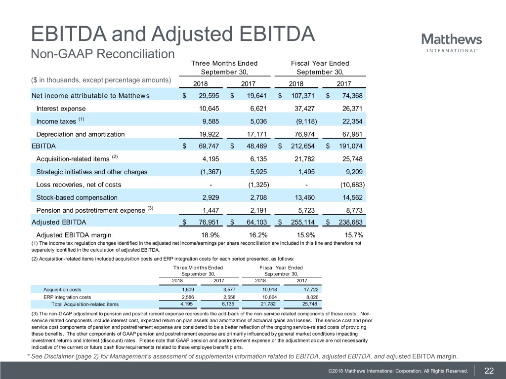 Adjusted Earnings Per Share Non-GAAP Reconciliation Three Months Ended Fiscal Year Ended September 30, September 30, ($ in thousands, except per share data) 2018 2017 2018 2017 Net income attributable to Matthews $ 29,595 $ 19,641 $ 107,371 $ 74,368 Acquisition-related items (1) 3,104 4,925 16,168 20,615 Pension and postretirement expense (2) 1,071 1,567 4,235 6,141 Intangible amortization expense 6,141 4,546 23,356 16,319 Strategic initiatives and other charges (1,012) 4,440 1,106 6,722 Loss recoveries, net of costs - (974) - (7,478) Tax-related (3) 771 200 (25,967) 485 Adjusted net income $ 39,670 $ 34,345 $ 126,269 $ 117,172 Adjusted EPS $ 1.23 $ 1.06 $ 3.96 $ 3.60 Note: Adjustments to net income for non-GAAP reconciling items were calculated using an income tax rate of 26.0% and 20.1%, for the three months ended September 30, 2018 and 2017, respectively, and 26.0% and 30.0% for the fiscal year ended September 30, 2018 and 2017, respectively. (1) Acquisition-related items included acquisition costs and ERP integration costs, net of tax, for each period presented, as follows: Three M onths Ended Fiscal Year Ended September 30, September 30, 2018 2017 2018 2017 Acquisition costs 1,191 3,093 8,128 13,828 ERP integration costs 1,913 1,832 8,040 6,787 Total Acquisition-related items 3,104 4,925 16,168 20,615 (2) The non-GAAP adjustment to pension and postretirement expense represents the add-back of the non-service related components of these costs. Non- service related components include interest cost, expected return on plan assets and amortization of actuarial gains and losses. The service cost and prior service cost components of pension and postretirement expense are considered to be a better reflection of the ongoing service-related costs of providing these benefits. The other components of GAAP pension and postretirement expense are primarily influenced by general market conditions impacting investment returns and interest (discount) rates. Please note that GAAP pension and postretirement expense or the adjustment above are not necessarily indicative of the current or future cash flow requirements related to these employee benefit plans. (3) The tax-related adjustments in fiscal 2018 consisted of income tax regulation changes which included an estimated favorable tax benefit of approximately $37,800 for the reduction in the Company’s net deferred tax liability principally reflecting the lower U.S. Federal tax rate, offset partially by an estimated repatriation transition tax charge and other charges of approximately $11,800, for the fiscal year ended September 30, 2018. * See Disclaimer (page 2) for Management’s assessment of supplemental information related to adjusted net income and adjusted EPS. ©2018 Matthews International Corporation. All Rights Reserved. 21