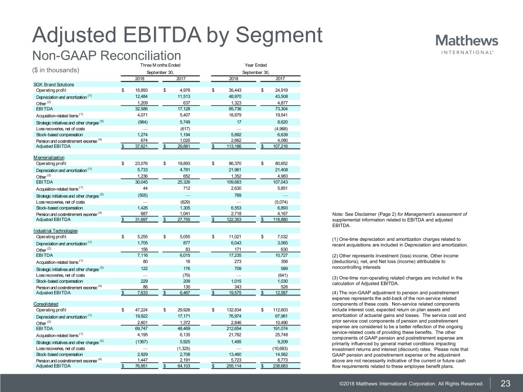 EBITDA and Adjusted EBITDA Non-GAAP Reconciliation Three Months Ended Fiscal Year Ended September 30, September 30, ($ in thousands, except percentage amounts) 2018 2017 2018 2017 Net income attributable to Matthews $ 29,595 $ 19,641 $ 107,371 $ 74,368 Interest expense 10,645 6,621 37,427 26,371 Income taxes (1) 9,585 5,036 (9,118) 22,354 Depreciation and amortization 19,922 17,171 76,974 67,981 EBITDA $ 69,747 $ 48,469 $ 212,654 $ 191,074 Acquisition-related items (2) 4,195 6,135 21,782 25,748 Strategic initiatives and other charges (1,367) 5,925 1,495 9,209 Loss recoveries, net of costs - (1,325) - (10,683) Stock-based compensation 2,929 2,708 13,460 14,562 Pension and postretirement expense (3) 1,447 2,191 5,723 8,773 Adjusted EBITDA $ 76,951 $ 64,103 $ 255,114 $ 238,683 Adjusted EBITDA margin 18.9% 16.2% 15.9% 15.7% (1) The income tax regulation changes identified in the adjusted net income/earnings per share reconciliation are included in this line and therefore not separately identified in the calculation of adjusted EBITDA. (2) Acquisition-related items included acquisition costs and ERP integration costs for each period presented, as follows: Three M onths Ended Fiscal Year Ended September 30, September 30, 2018 2017 2018 2017 Acquisition costs 1,609 3,577 10,918 17,722 ERP integration costs 2,586 2,558 10,864 8,026 Total Acquisition-related items 4,195 6,135 21,782 25,748 (3) The non-GAAP adjustment to pension and postretirement expense represents the add-back of the non-service related components of these costs. Non- service related components include interest cost, expected return on plan assets and amortization of actuarial gains and losses. The service cost and prior service cost components of pension and postretirement expense are considered to be a better reflection of the ongoing service-related costs of providing these benefits. The other components of GAAP pension and postretirement expense are primarily influenced by general market conditions impacting investment returns and interest (discount) rates. Please note that GAAP pension and postretirement expense or the adjustment above are not necessarily indicative of the current or future cash flow requirements related to these employee benefit plans. * See Disclaimer (page 2) for Management’s assessment of supplemental information related to EBITDA, adjusted EBITDA, and adjusted EBITDA margin. ©2018 Matthews International Corporation. All Rights Reserved. 22