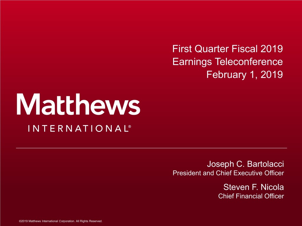 First Quarter Fiscal 2019 Earnings Teleconference February 1, 2019 Joseph C. Bartolacci President and Chief Executive Officer Steven F. Nicola Chief Financial Officer ©2019 Matthews International Corporation. All Rights Reserved.