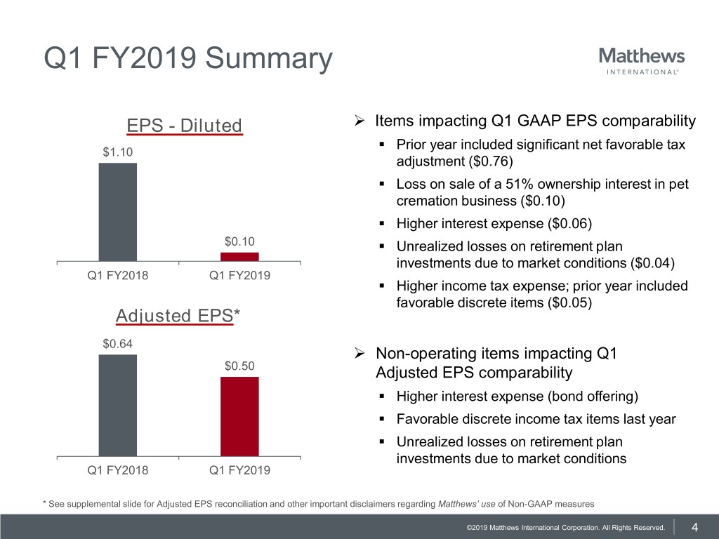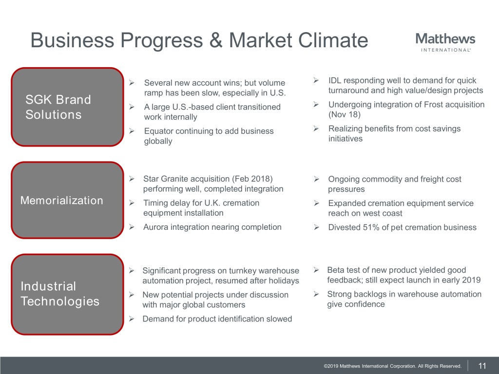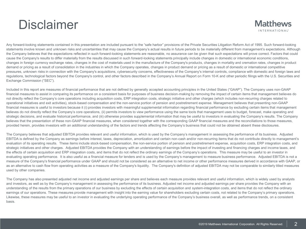 Disclaimer Any forward-looking statements contained in this presentation are included pursuant to the “safe harbor” provisions of the Private Securities Litigation Reform Act of 1995. Such forward-looking statements involve known and unknown risks and uncertainties that may cause the Company’s actual results in future periods to be materially different from management’s expectations. Although the Company believes that the expectations reflected in such forward-looking statements are reasonable, no assurance can be given that such expectations will prove correct. Factors that could cause the Company's results to differ materially from the results discussed in such forward-looking statements principally include changes in domestic or international economic conditions, changes in foreign currency exchange rates, changes in the cost of materials used in the manufacture of the Company's products, changes in mortality and cremation rates, changes in product demand or pricing as a result of consolidation in the industries in which the Company operates, changes in product demand or pricing as a result of domestic or international competitive pressures, unknown risks in connection with the Company's acquisitions, cybersecurity concerns, effectiveness of the Company's internal controls, compliance with domestic and foreign laws and regulations, technological factors beyond the Company's control, and other factors described in the Company’s Annual Report on Form 10-K and other periodic filings with the U.S. Securities and Exchange Commission (“SEC”). Included in this report are measures of financial performance that are not defined by generally accepted accounting principles in the United States (“GAAP”). The Company uses non-GAAP financial measures to assist in comparing its performance on a consistent basis for purposes of business decision-making by removing the impact of certain items that management believes do not directly reflect the Company’s core operations including acquisition costs, ERP integration costs, strategic initiative and other charges (which includes non-recurring charges related to operational initiatives and exit activities), stock-based compensation and the non-service portion of pension and postretirement expense. Management believes that presenting non-GAAP financial measures is useful to investors because it (i) provides investors with meaningful supplemental information regarding financial performance by excluding certain items that management believes do not directly reflect the Company’s core operations, (ii) permits investors to view performance using the same tools that management uses to budget, forecast, make operating and strategic decisions, and evaluate historical performance, and (iii) otherwise provides supplemental information that may be useful to investors in evaluating the Company’s results. The Company believes that the presentation of these non-GAAP financial measures, when considered together with the corresponding GAAP financial measures and the reconciliations to those measures, provided herein, provides investors with an additional understanding of the factors and trends affecting the Company’s business that could not be obtained absent these disclosures. The Company believes that adjusted EBITDA provides relevant and useful information, which is used by the Company’s management in assessing the performance of its business. Adjusted EBITDA is defined by the Company as earnings before interest, taxes, depreciation, amortization and certain non-cash and/or non-recurring items that do not contribute directly to management’s evaluation of its operating results. These items include stock-based compensation, the non-service portion of pension and postretirement expense, acquisition costs, ERP integration costs, and strategic initiatives and other charges. Adjusted EBITDA provides the Company with an understanding of earnings before the impact of investing and financing charges and income taxes, and the effects of certain acquisition and ERP integration costs, and items that do not reflect the ordinary earnings of the Company’s operations. This measure may be useful to an investor in evaluating operating performance. It is also useful as a financial measure for lenders and is used by the Company’s management to measure business performance. Adjusted EBITDA is not a measure of the Company's financial performance under GAAP and should not be considered as an alternative to net income or other performance measures derived in accordance with GAAP, or as an alternative to cash flow from operating activities as a measure of the Company's liquidity. The Company's definition of adjusted EBITDA may not be comparable to similarly titled measures used by other companies. The Company has also presented adjusted net income and adjusted earnings per share and believes each measure provides relevant and useful information, which is widely used by analysts and investors, as well as by the Company’s management in assessing the performance of its business. Adjusted net income and adjusted earnings per share provides the Company with an understanding of the results from the primary operations of our business by excluding the effects of certain acquisition and system-integration costs, and items that do not reflect the ordinary earnings of our operations. These measures provide management with insight into the earning value for shareholders excluding certain costs, not related to the Company’s primary operations. Likewise, these measures may be useful to an investor in evaluating the underlying operating performance of the Company’s business overall, as well as performance trends, on a consistent basis. ©2019 Matthews International Corporation. All Rights Reserved. 2