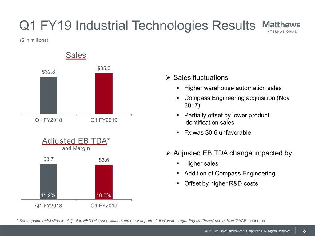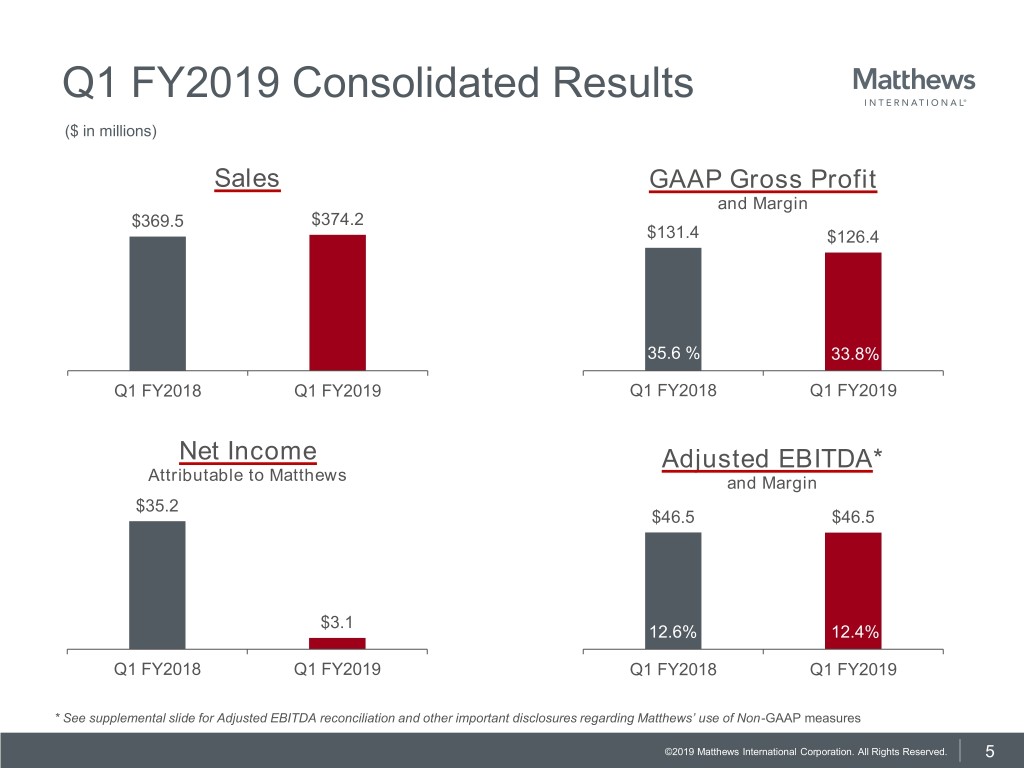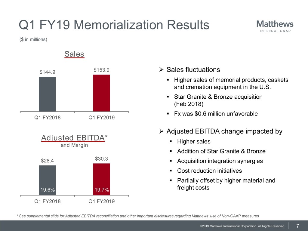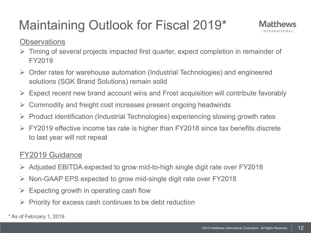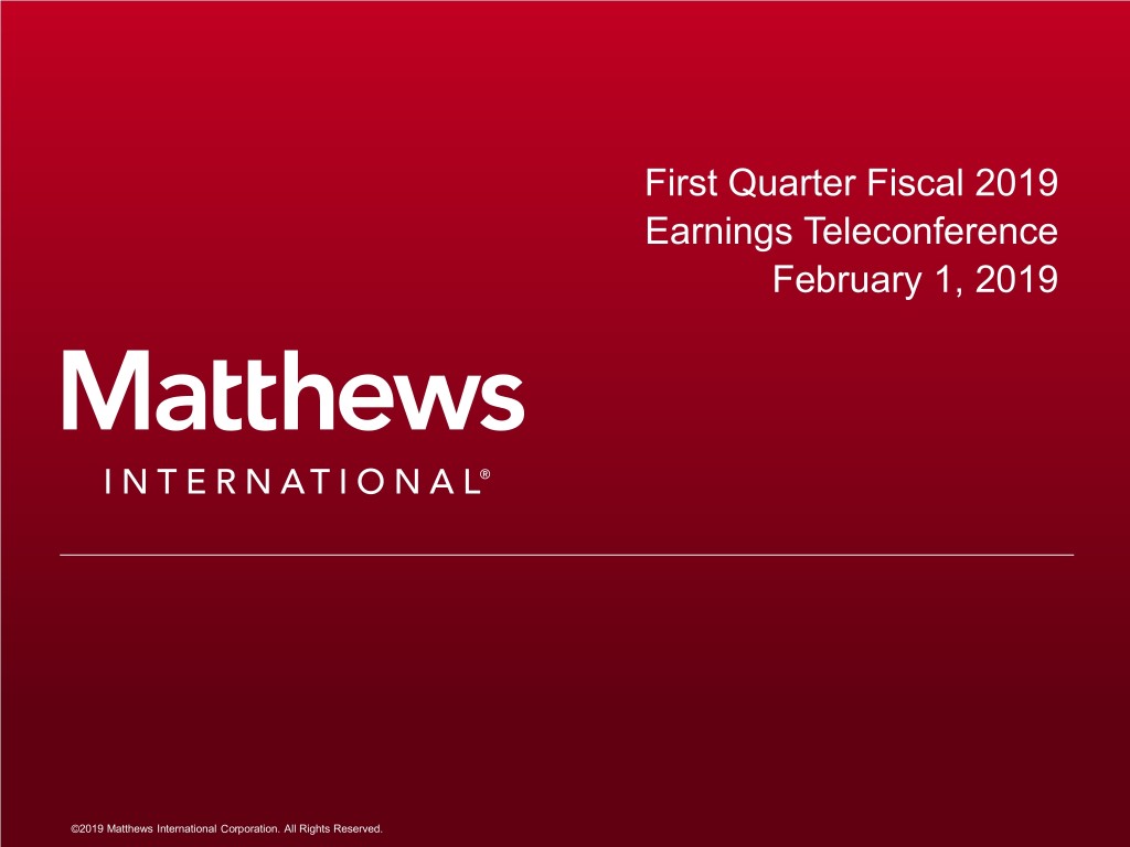First Quarter Fiscal 2019 Earnings Teleconference February 1, 2019 ©2019 Matthews International Corporation. All Rights Reserved.