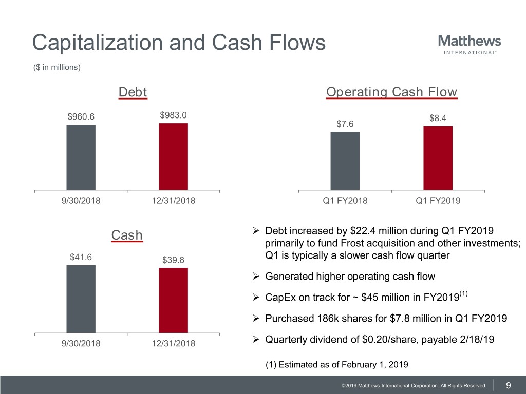 Capitalization and Cash Flows ($ in millions) Debt Operating Cash Flow $960.6 $983.0 $8.4 $7.6 9/30/2018 12/31/2018 Q1 FY2018 Q1 FY2019 Cash Debt increased by $22.4 million during Q1 FY2019 primarily to fund Frost acquisition and other investments; $41.6 $39.8 Q1 is typically a slower cash flow quarter Generated higher operating cash flow CapEx on track for ~ $45 million in FY2019(1) Purchased 186k shares for $7.8 million in Q1 FY2019 9/30/2018 12/31/2018 Quarterly dividend of $0.20/share, payable 2/18/19 (1) Estimated as of February 1, 2019 ©2019 Matthews International Corporation. All Rights Reserved. 9