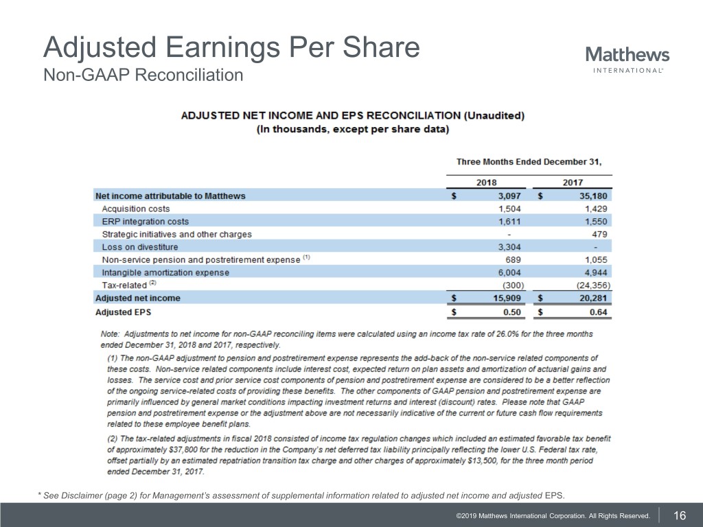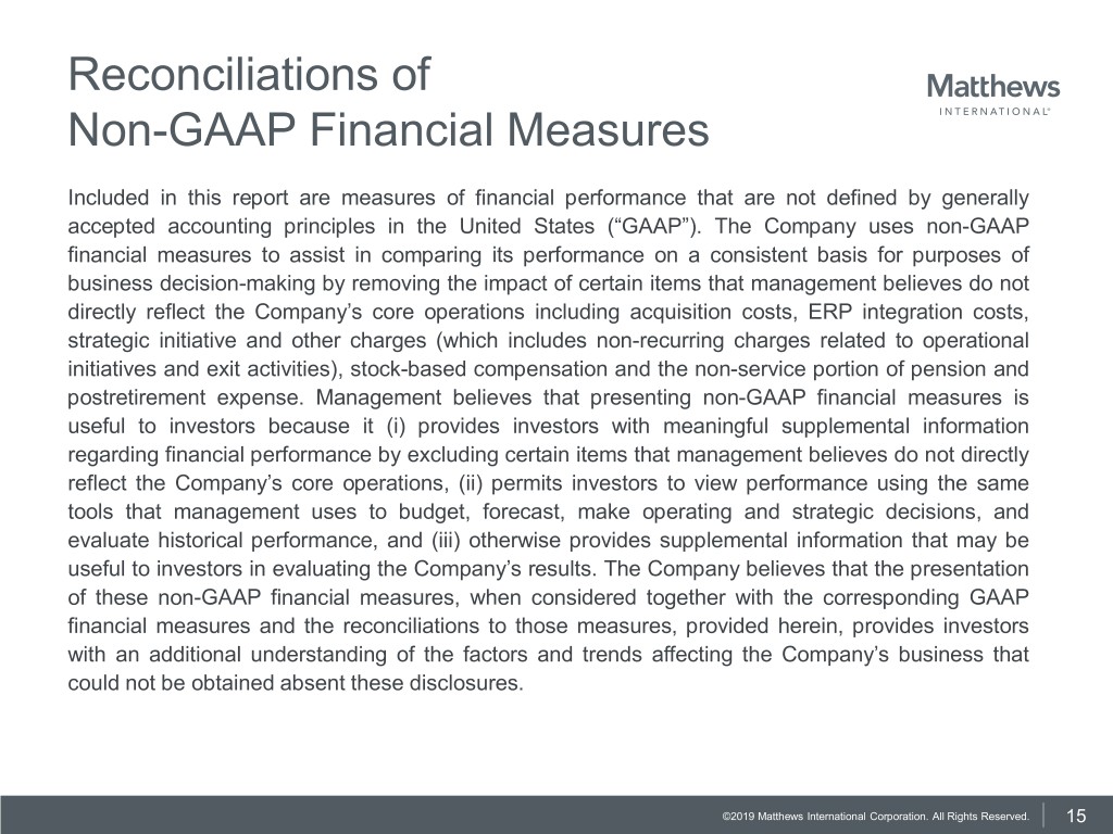 Reconciliations of Non-GAAP Financial Measures Included in this report are measures of financial performance that are not defined by generally accepted accounting principles in the United States (“GAAP”). The Company uses non-GAAP financial measures to assist in comparing its performance on a consistent basis for purposes of business decision-making by removing the impact of certain items that management believes do not directly reflect the Company’s core operations including acquisition costs, ERP integration costs, strategic initiative and other charges (which includes non-recurring charges related to operational initiatives and exit activities), stock-based compensation and the non-service portion of pension and postretirement expense. Management believes that presenting non-GAAP financial measures is useful to investors because it (i) provides investors with meaningful supplemental information regarding financial performance by excluding certain items that management believes do not directly reflect the Company’s core operations, (ii) permits investors to view performance using the same tools that management uses to budget, forecast, make operating and strategic decisions, and evaluate historical performance, and (iii) otherwise provides supplemental information that may be useful to investors in evaluating the Company’s results. The Company believes that the presentation of these non-GAAP financial measures, when considered together with the corresponding GAAP financial measures and the reconciliations to those measures, provided herein, provides investors with an additional understanding of the factors and trends affecting the Company’s business that could not be obtained absent these disclosures. ©2019 Matthews International Corporation. All Rights Reserved. 15