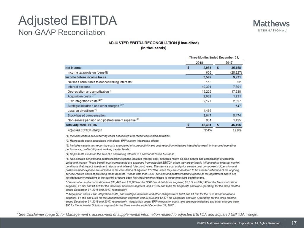 Adjusted EBITDA Non-GAAP Reconciliation * See Disclaimer (page 2) for Management’s assessment of supplemental information related to adjusted EBITDA and adjusted EBITDA margin. ©2019 Matthews International Corporation. All Rights Reserved. 17