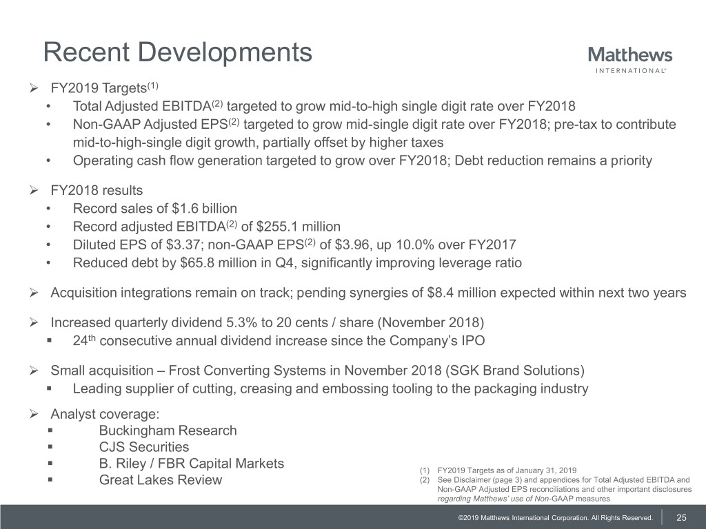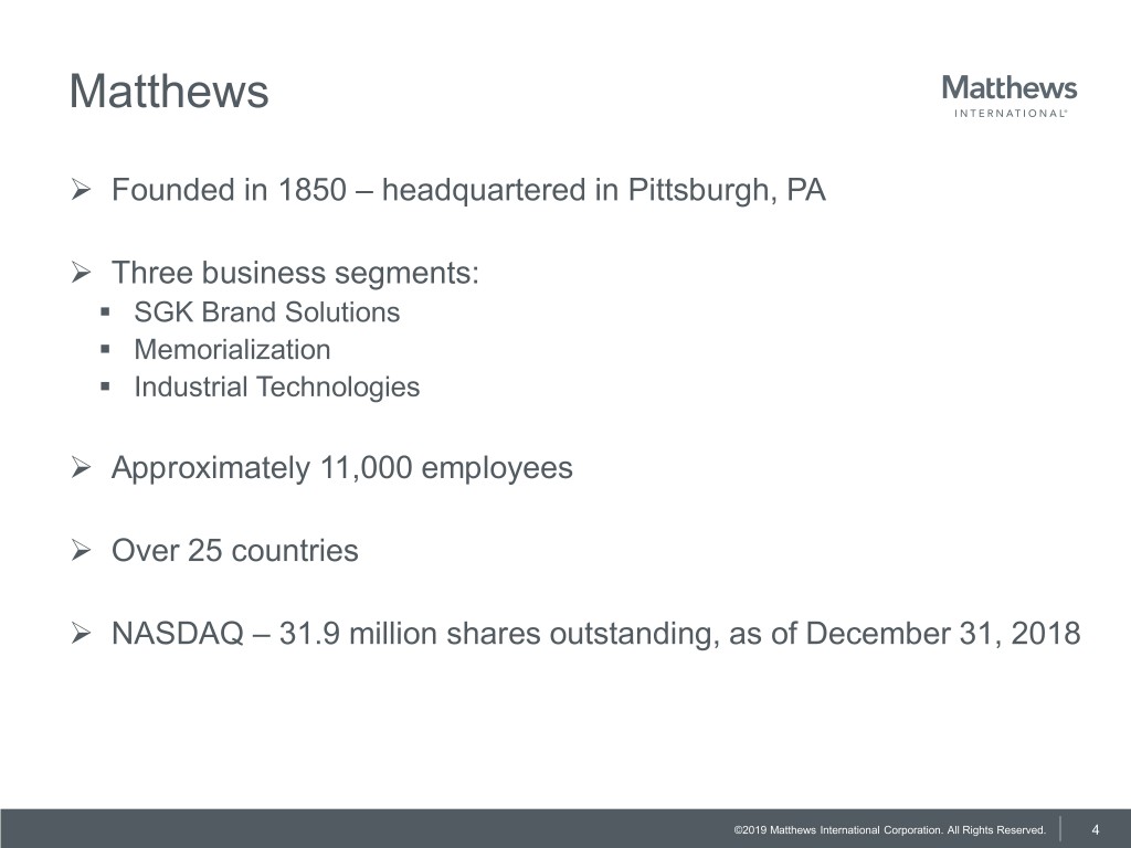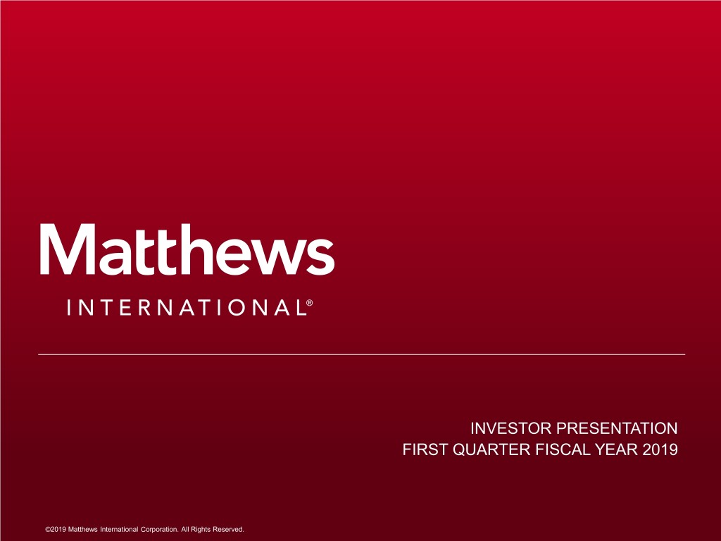 INVESTOR PRESENTATION FIRST QUARTER FISCAL YEAR 2019 ©2019 Matthews International Corporation. All Rights Reserved.