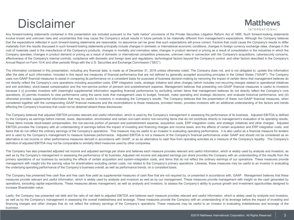 Disclaimer Any forward-looking statements contained in this presentation are included pursuant to the “safe harbor” provisions of the Private Securities Litigation Reform Act of 1995. Such forward-looking statements involve known and unknown risks and uncertainties that may cause the Company’s actual results in future periods to be materially different from management’s expectations. Although the Company believes that the expectations reflected in such forward-looking statements are reasonable, no assurance can be given that such expectations will prove correct. Factors that could cause the Company's results to differ materially from the results discussed in such forward-looking statements principally include changes in domestic or international economic conditions, changes in foreign currency exchange rates, changes in the cost of materials used in the manufacture of the Company's products, changes in mortality and cremation rates, changes in product demand or pricing as a result of consolidation in the industries in which the Company operates, changes in product demand or pricing as a result of domestic or international competitive pressures, unknown risks in connection with the Company's acquisitions, cybersecurity concerns, effectiveness of the Company's internal controls, compliance with domestic and foreign laws and regulations, technological factors beyond the Company's control, and other factors described in the Company’s Annual Report on Form 10-K and other periodic filings with the U.S. Securities and Exchange Commission (“SEC”). The information contained in this presentation, including any financial data, is made as of December 31, 2018 unless otherwise noted. The Company does not, and is not obligated to, update this information after the date of such information. Included in this report are measures of financial performance that are not defined by generally accepted accounting principles in the United States (“GAAP”). The Company uses non-GAAP financial measures to assist in comparing its performance on a consistent basis for purposes of business decision-making by removing the impact of certain items that management believes do not directly reflect the Company’s core operations including acquisition costs, ERP integration costs, strategic initiative and other charges (which includes non-recurring charges related to operational initiatives and exit activities), stock-based compensation and the non-service portion of pension and postretirement expense. Management believes that presenting non-GAAP financial measures is useful to investors because it (i) provides investors with meaningful supplemental information regarding financial performance by excluding certain items that management believes do not directly reflect the Company’s core operations, (ii) permits investors to view performance using the same tools that management uses to budget, forecast, make operating and strategic decisions, and evaluate historical performance, and (iii) otherwise provides supplemental information that may be useful to investors in evaluating the Company’s results. The Company believes that the presentation of these non-GAAP financial measures, when considered together with the corresponding GAAP financial measures and the reconciliations to those measures, provided herein, provides investors with an additional understanding of the factors and trends affecting the Company’s business that could not be obtained absent these disclosures. The Company believes that adjusted EBITDA provides relevant and useful information, which is used by the Company’s management in assessing the performance of its business. Adjusted EBITDA is defined by the Company as earnings before interest, taxes, depreciation, amortization and certain non-cash and/or non-recurring items that do not contribute directly to management’s evaluation of its operating results. These items include stock-based compensation, the non-service portion of pension and postretirement expense, acquisition costs, ERP integration costs, and strategic initiatives and other charges. Adjusted EBITDA provides the Company with an understanding of earnings before the impact of investing and financing charges and income taxes, and the effects of certain acquisition and ERP integration costs, and items that do not reflect the ordinary earnings of the Company’s operations. This measure may be useful to an investor in evaluating operating performance. It is also useful as a financial measure for lenders and is used by the Company’s management to measure business performance. Adjusted EBITDA is not a measure of the Company's financial performance under GAAP and should not be considered as an alternative to net income or other performance measures derived in accordance with GAAP, or as an alternative to cash flow from operating activities as a measure of the Company's liquidity. The Company's definition of adjusted EBITDA may not be comparable to similarly titled measures used by other companies. The Company has also presented adjusted net income and adjusted earnings per share and believes each measure provides relevant and useful information, which is widely used by analysts and investors, as well as by the Company’s management in assessing the performance of its business. Adjusted net income and adjusted earnings per share provides the Company with an understanding of the results from the primary operations of our business by excluding the effects of certain acquisition and system-integration costs, and items that do not reflect the ordinary earnings of our operations. These measures provide management with insight into the earning value for shareholders excluding certain costs, not related to the Company’s primary operations. Likewise, these measures may be useful to an investor in evaluating the underlying operating performance of the Company’s business overall, as well as performance trends, on a consistent basi