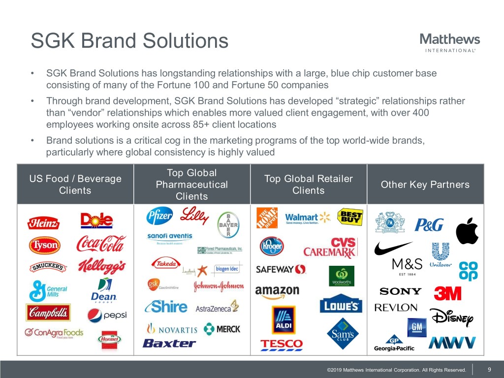 SGK Brand Solutions Marketing / Packaging Execution Marketing / Packaging Creative / Adaptive SGK Brand Solutions Execution + = Premedia / Tooling / Merchandising ©2019 Matthews International Corporation. All Rights Reserved. 8