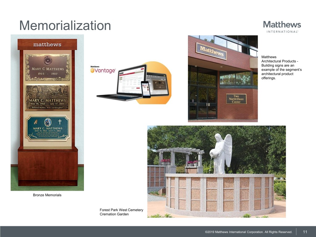 Memorialization Matthews Architectural Products - Building signs are an example of the segment’s architectural product offerings. Bronze Memorials Forest Park West Cemetery Cremation Garden ©2019 Matthews International Corporation. All Rights Reserved. 11