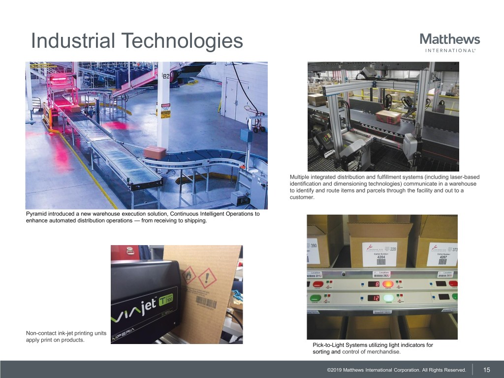 Industrial Technologies Multiple integrated distribution and fulfillment systems (including laser-based identification and dimensioning technologies) communicate in a warehouse to identify and route items and parcels through the facility and out to a customer. Pyramid introduced a new warehouse execution solution, Continuous Intelligent Operations to enhance automated distribution operations — from receiving to shipping. Non-contact ink-jet printing units apply print on products. Pick-to-Light Systems utilizing light indicators for sorting and control of merchandise. ©2019 Matthews International Corporation. All Rights Reserved. 15