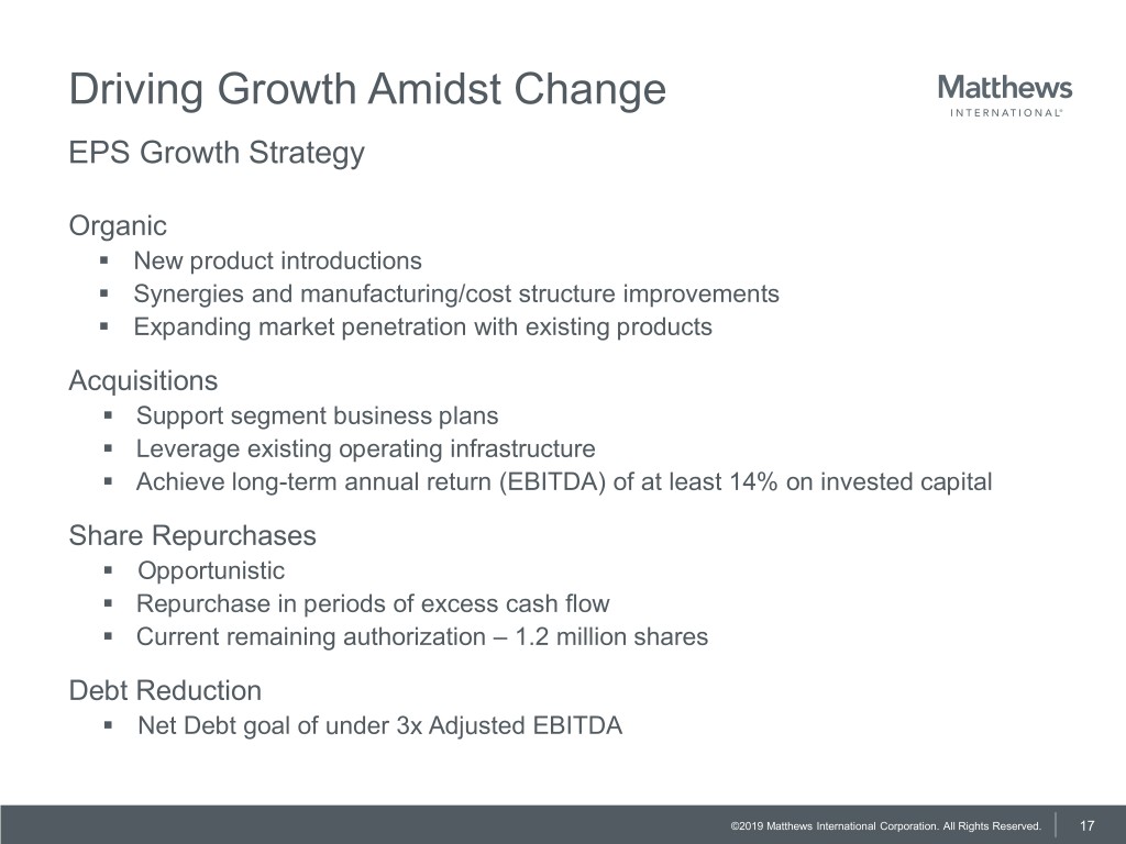 Financial Overview ©2019 Matthews International Corporation. All Rights Reserved. 16