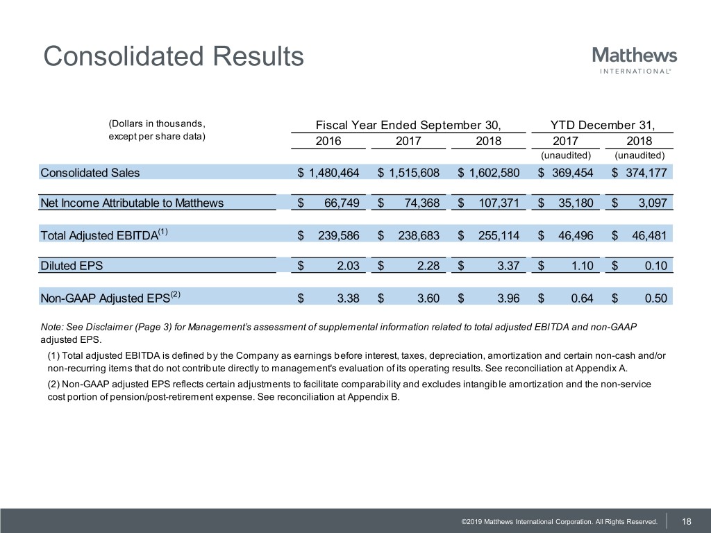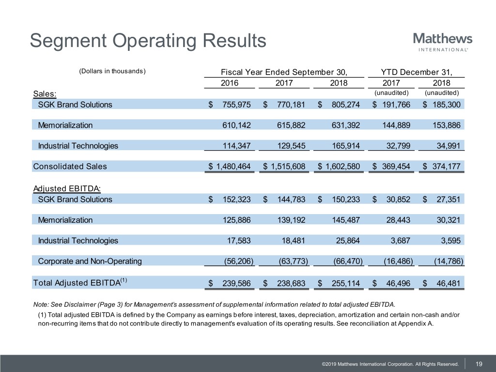 Consolidated Results (Dollars in thousands, Fiscal Year Ended September 30, YTD December 31, except per share data) 2016 2017 2018 2017 2018 (unaudited) (unaudited) Consolidated Sales $ 1,480,464 $ 1,515,608 $ 1,602,580 $ 369,454 $ 374,177 Net Income Attributable to Matthews $ 66,749 $ 74,368 $ 107,371 $ 35,180 $ 3,097 Total Adjusted EBITDA(1) $ 239,586 $ 238,683 $ 255,114 $ 46,496 $ 46,481 Diluted EPS $ 2.03 $ 2.28 $ 3.37 $ 1.10 $ 0.10 Non-GAAP Adjusted EPS(2) $ 3.38 $ 3.60 $ 3.96 $ 0.64 $ 0.50 Note: See Disclaimer (Page 3) for Management’s assessment of supplemental information related to total adjusted EBITDA and non-GAAP adjusted EPS. (1) Total adjusted EBITDA is defined by the Company as earnings before interest, taxes, depreciation, amortization and certain non-cash and/or non-recurring items that do not contribute directly to management's evaluation of its operating results. See reconciliation at Appendix A. (2) Non-GAAP adjusted EPS reflects certain adjustments to facilitate comparability and excludes intangible amortization and the non-service cost portion of pension/post-retirement expense. See reconciliation at Appendix B. ©2019 Matthews International Corporation. All Rights Reserved. 18