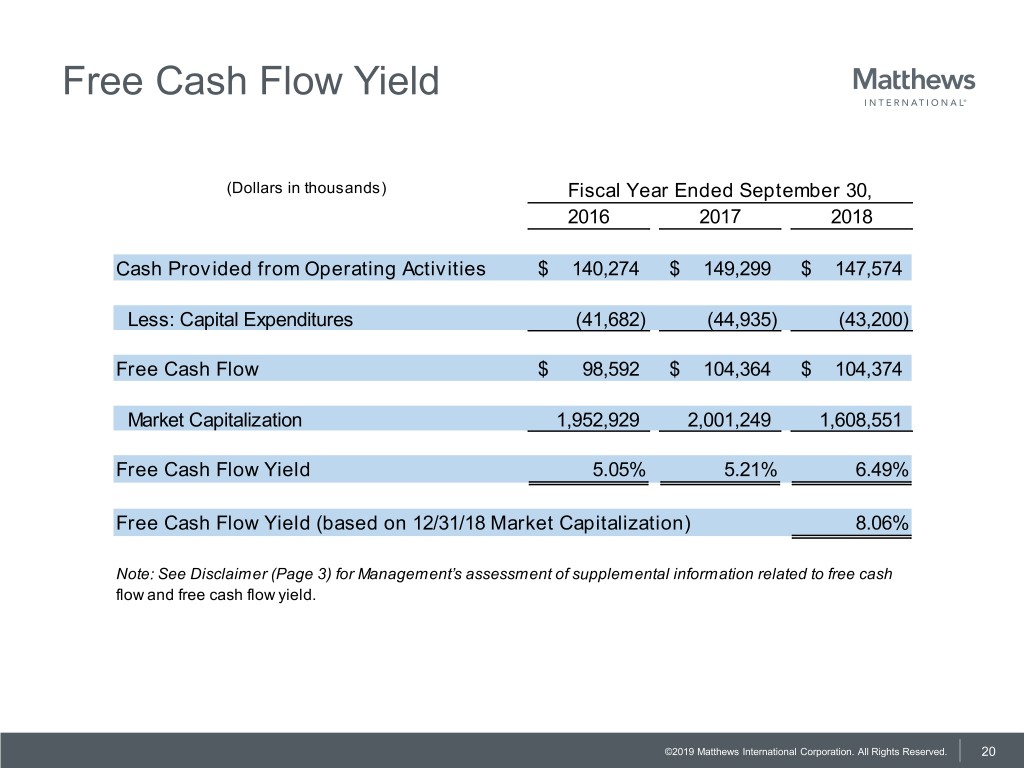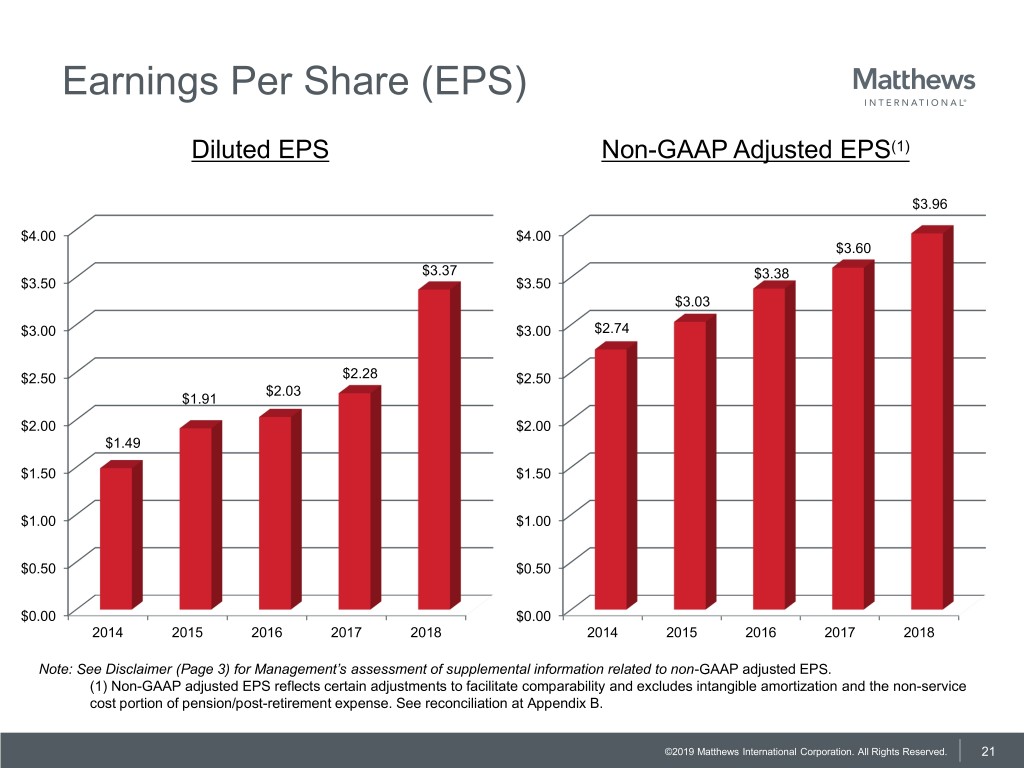 Free Cash Flow Yield (Dollars in thousands) Fiscal Year Ended September 30, 2016 2017 2018 Cash Provided from Operating Activities $ 140,274 $ 149,299 $ 147,574 Less: Capital Expenditures (41,682) (44,935) (43,200) Free Cash Flow $ 98,592 $ 104,364 $ 104,374 Market Capitalization 1,952,929 2,001,249 1,608,551 Free Cash Flow Yield 5.05% 5.21% 6.49% Free Cash Flow Yield (based on 12/31/18 Market Capitalization) 8.06% Note: See Disclaimer (Page 3) for Management’s assessment of supplemental information related to free cash flow and free cash flow yield. ©2019 Matthews International Corporation. All Rights Reserved. 20
