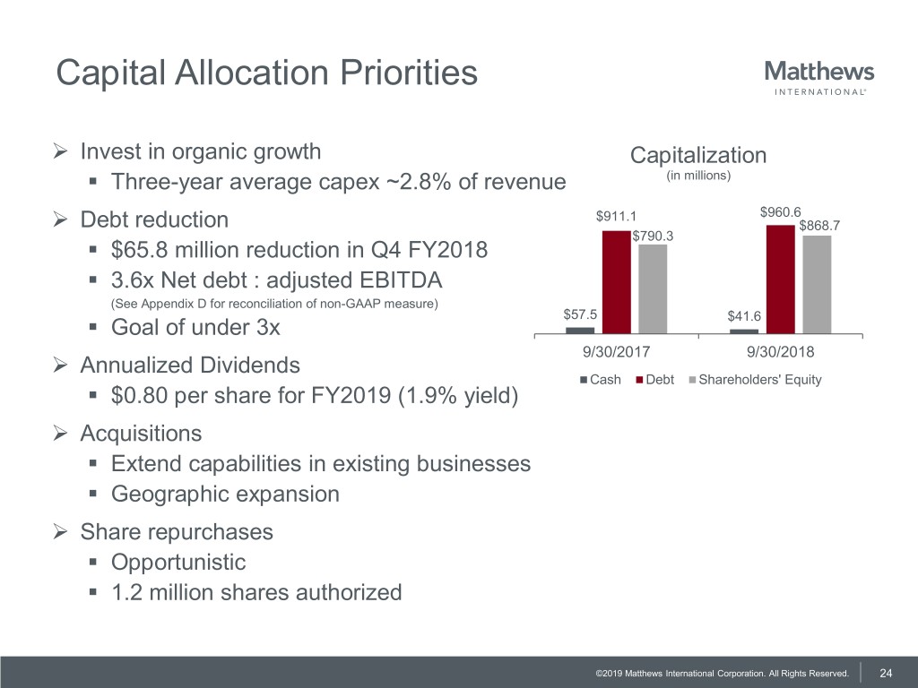 Common Stock Price $70.00 $60.76 $62.25 $60.00 $50.74 $50.15 $48.97 $50.00 $43.89 $38.08 $40.00 $35.18 $35.36 $30.73 $29.82 $30.00 $20.00 $10.00 $0.00 9/30/2008 9/30/2009 9/30/2010 9/30/2011 9/30/2012 9/30/2013 9/30/2014 9/30/2015 9/30/2016 9/30/2017 9/30/2018 Note: Stock price obtained from Nasdaq for each respective month-end period. ©2019 Matthews International Corporation. All Rights Reserved. 23