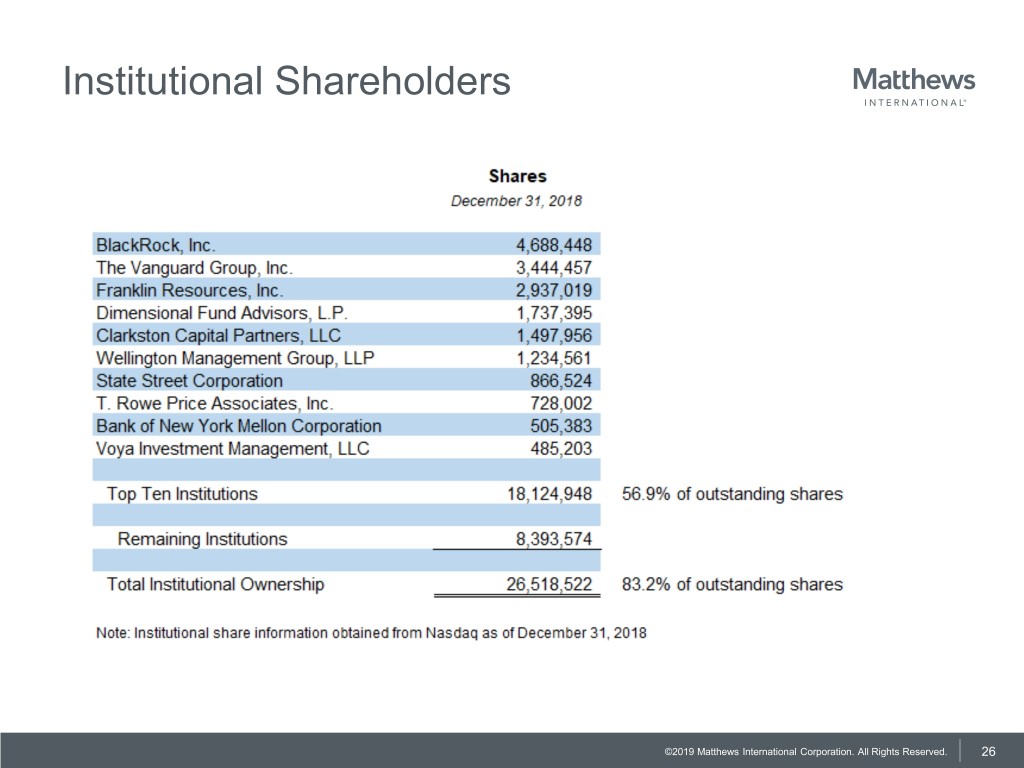 Institutional Shareholders ©2019 Matthews International Corporation. All Rights Reserved. 26