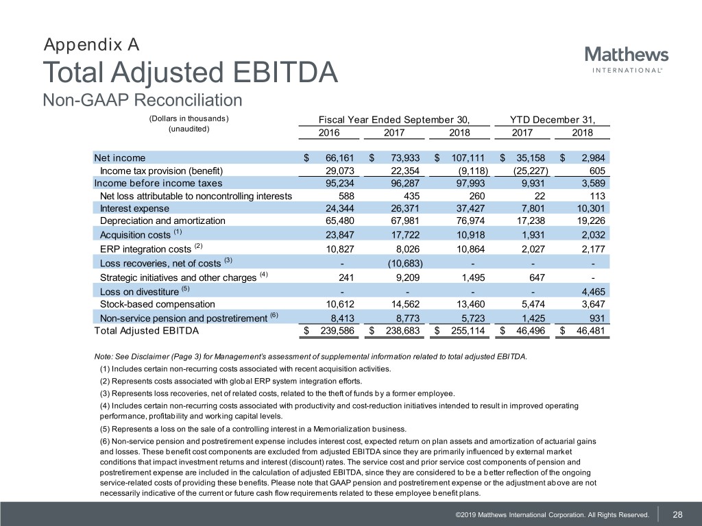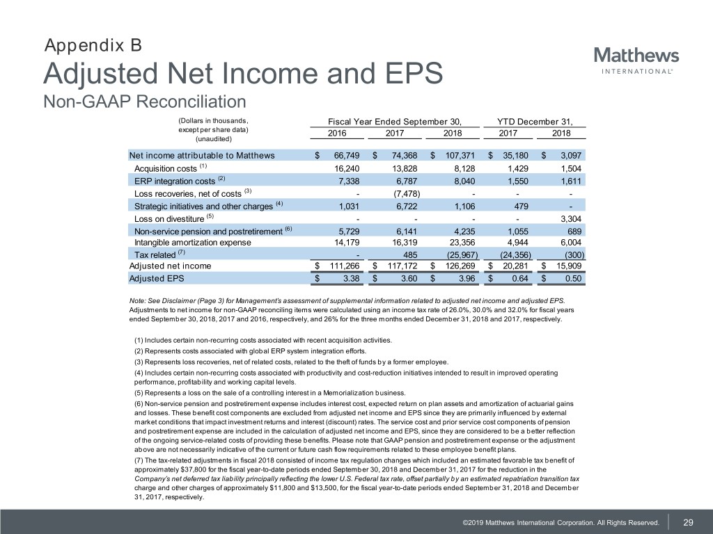 Appendix A Total Adjusted EBITDA Non-GAAP Reconciliation (Dollars in thousands) Fiscal Year Ended September 30, YTD December 31, (unaudited) 2016 2017 2018 2017 2018 Net income $ 66,161 $ 73,933 $ 107,111 $ 35,158 $ 2,984 Income tax provision (benefit) 29,073 22,354 (9,118) (25,227) 605 Income before income taxes 95,234 96,287 97,993 9,931 3,589 Net loss attributable to noncontrolling interests 588 435 260 22 113 Interest expense 24,344 26,371 37,427 7,801 10,301 Depreciation and amortization 65,480 67,981 76,974 17,238 19,226 Acquisition costs (1) 23,847 17,722 10,918 1,931 2,032 ERP integration costs (2) 10,827 8,026 10,864 2,027 2,177 Loss recoveries, net of costs (3) - (10,683) - - - Strategic initiatives and other charges (4) 241 9,209 1,495 647 - Loss on divestiture (5) - - - - 4,465 Stock-based compensation 10,612 14,562 13,460 5,474 3,647 Non-service pension and postretirement (6) 8,413 8,773 5,723 1,425 931 Total Adjusted EBITDA $ 239,586 $ 238,683 $ 255,114 $ 46,496 $ 46,481 Note: See Disclaimer (Page 3) for Management’s assessment of supplemental information related to total adjusted EBITDA. (1) Includes certain non-recurring costs associated with recent acquisition activities. (2) Represents costs associated with global ERP system integration efforts. (3) Represents loss recoveries, net of related costs, related to the theft of funds by a former employee. (4) Includes certain non-recurring costs associated with productivity and cost-reduction initiatives intended to result in improved operating performance, profitability and working capital levels. (5) Represents a loss on the sale of a controlling interest in a Memorialization business. (6) Non-service pension and postretirement expense includes interest cost, expected return on plan assets and amortization of actuarial gains and losses. These benefit cost components are excluded from adjusted EBITDA since they are primarily influenced by external market conditions that impact investment returns and interest (discount) rates. The service cost and prior service cost components of pension and postretirement expense are included in the calculation of adjusted EBITDA, since they are considered to be a better reflection of the ongoing service-related costs of providing these benefits. Please note that GAAP pension and postretirement expense or the adjustment above are not necessarily indicative of the current or future cash flow requirements related to these employee benefit plans. ©2019 Matthews International Corporation. All Rights Reserved. 28
