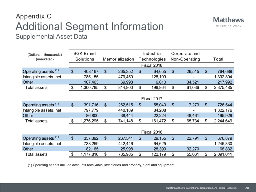 Appendix C Additional Segment Information Supplemental Asset Data (Dollars in thousands) SGK Brand Industrial Corporate and (unaudited) Solutions Memorialization Technologies Non-Operating Total Fiscal 2018 Operating assets (1) $ 408,167 $ 265,352 $ 64,655 $ 26,515 $ 764,689 Intangible assets, net 785,155 479,450 128,199 - 1,392,804 Other 107,463 69,998 6,010 34,521 217,992 Total assets $ 1,300,785 $ 814,800 $ 198,864 $ 61,036 $ 2,375,485 Fiscal 2017 Operating assets (1) $ 391,716 $ 262,515 $ 55,040 $ 17,273 $ 726,544 Intangible assets, net 797,779 440,189 84,208 - 1,322,176 Other 86,800 38,444 22,224 48,461 195,929 Total assets $ 1,276,295 $ 741,148 $ 161,472 $ 65,734 $ 2,244,649 Fiscal 2016 Operating assets (1) $ 357,392 $ 267,541 $ 29,155 $ 22,791 $ 676,879 Intangible assets, net 738,259 442,446 64,625 - 1,245,330 Other 82,165 25,998 28,399 32,270 168,832 Total assets $ 1,177,816 $ 735,985 $ 122,179 $ 55,061 $ 2,091,041 (1) Operating assets include accounts receivable, inventories and property, plant and equipment. ©2019 Matthews International Corporation. All Rights Reserved. 30