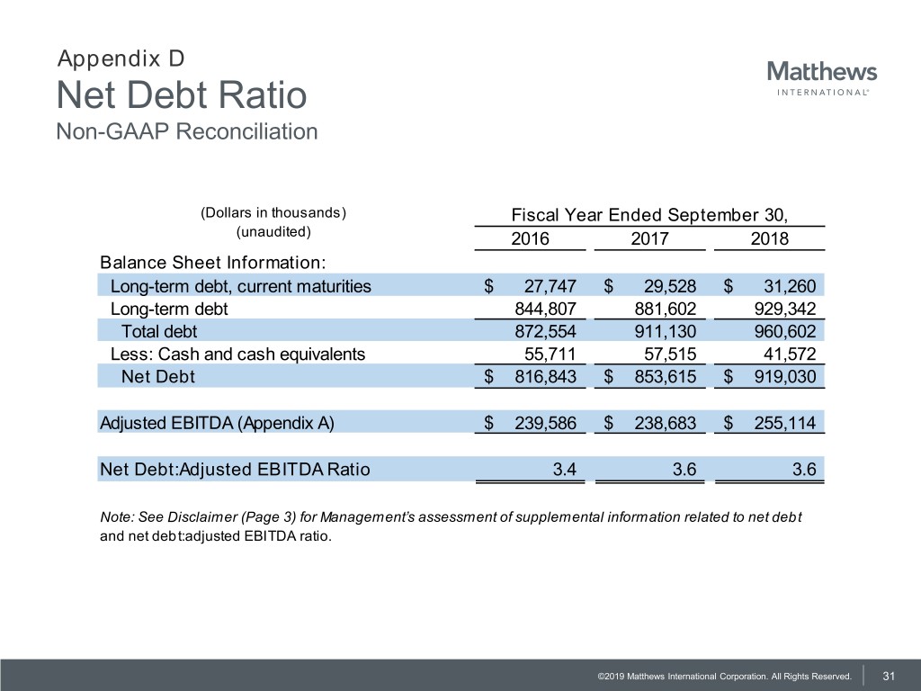 Appendix D Net Debt Ratio Non-GAAP Reconciliation (Dollars in thousands) Fiscal Year Ended September 30, (unaudited) 2016 2017 2018 Balance Sheet Information: Long-term debt, current maturities $ 27,747 $ 29,528 $ 31,260 Long-term debt 844,807 881,602 929,342 Total debt 872,554 911,130 960,602 Less: Cash and cash equivalents 55,711 57,515 41,572 Net Debt $ 816,843 $ 853,615 $ 919,030 Adjusted EBITDA (Appendix A) $ 239,586 $ 238,683 $ 255,114 Net Debt:Adjusted EBITDA Ratio 3.4 3.6 3.6 Note: See Disclaimer (Page 3) for Management’s assessment of supplemental information related to net debt and net debt:adjusted EBITDA ratio. ©2019 Matthews International Corporation. All Rights Reserved. 31