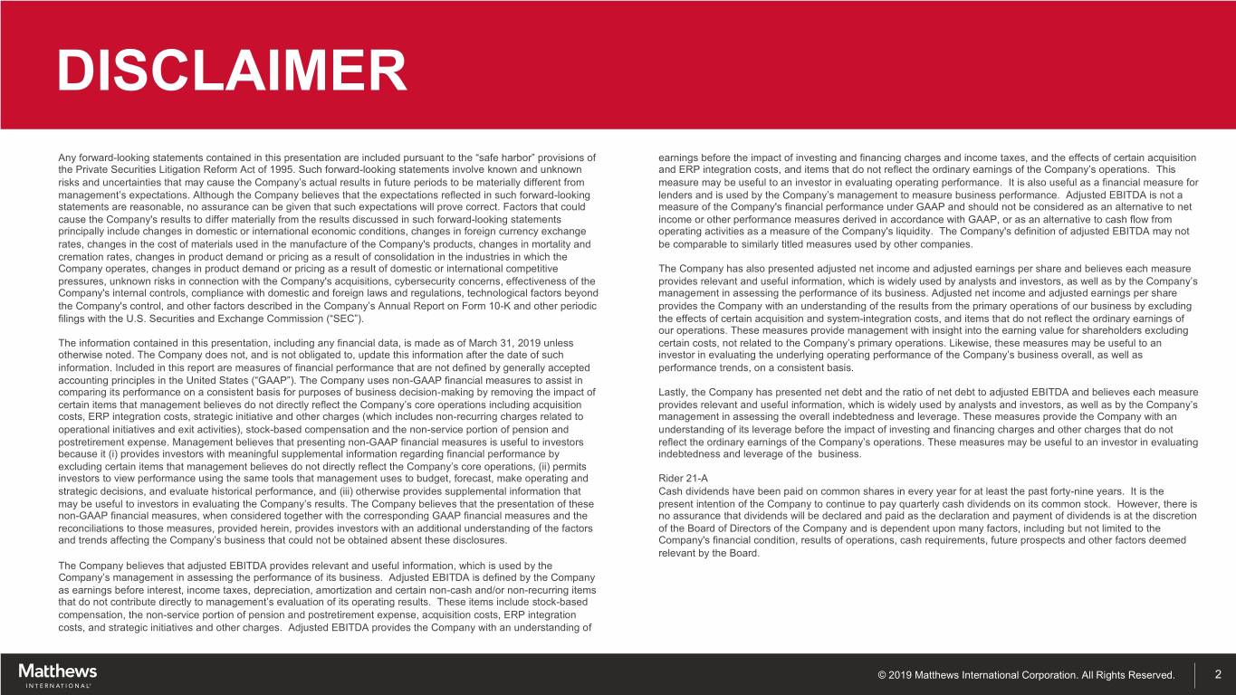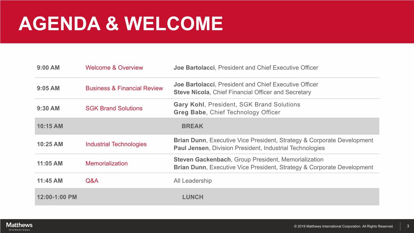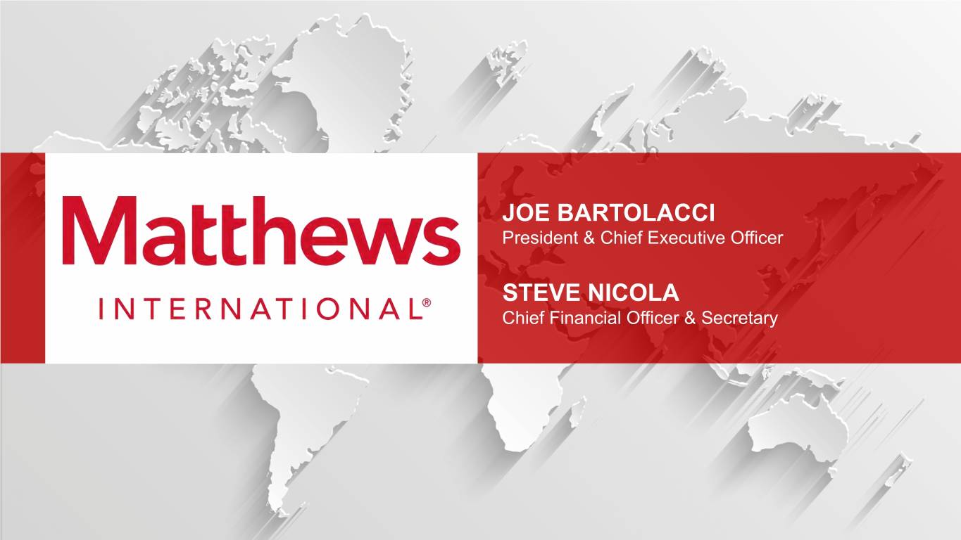 JOE BARTOLACCI President & Chief Executive Officer STEVE NICOLA Chief Financial Officer & Secretary © 2019 Matthews International Corporation. All Rights Reserved.