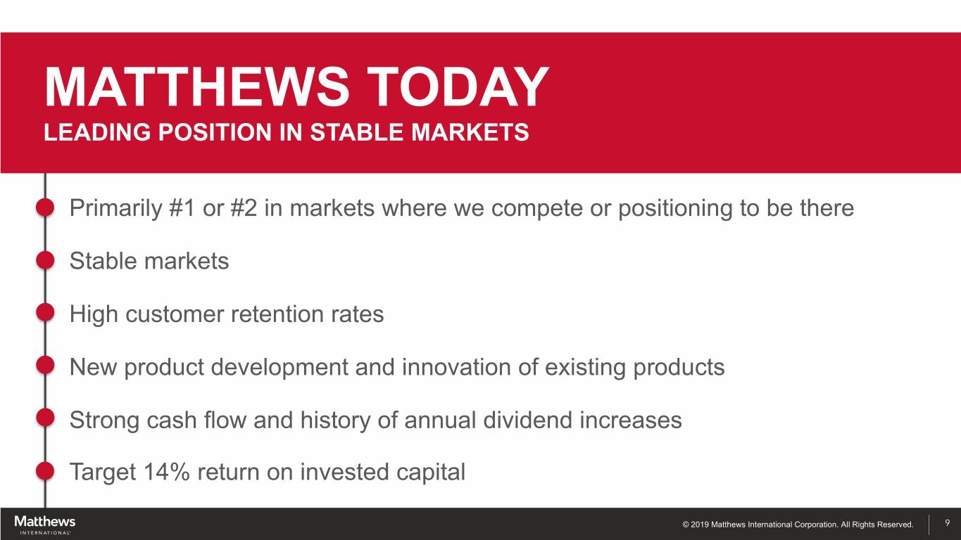 GLOBAL PRODUCTS AND SERVICES ACROSS DIVERSE BUSINESSES AMERICAS EUROPE ASIA-PACIFIC / OTHER 67% 28% 5% 11,000 EMPLOYEES | 6 CONTINENTS © 2019 Matthews International Corporation. All Rights Reserved. 8