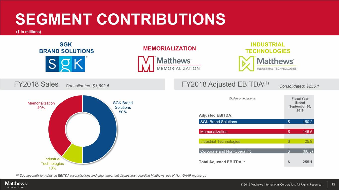 CONSISTENT CASH GENERATION ($ in millions) $149.3 $147.6 $140.3 $41.7 $44.9 $43.2 $24.6 $19.4 $21.8 FY2016 FY2017 FY2018 Operating Cash Flow Dividends CapEx © 2019 Matthews International Corporation. All Rights Reserved. 11