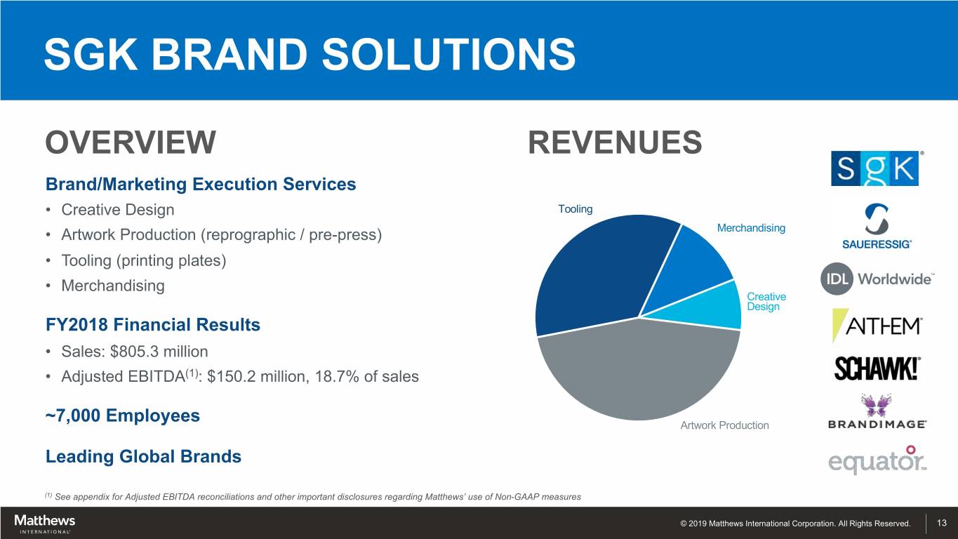 SEGMENT CONTRIBUTIONS ($ in millions) SGK INDUSTRIAL BRAND SOLUTIONS MEMORIALIZATION TECHNOLOGIES (1) FY2018 Sales Consolidated: $1,602.6 FY2018 Adjusted EBITDA Consolidated: $255.1 (Dollars in thousands) Fiscal Year Memorialization SGK Brand Ended 40% Solutions September 30, 50% 2018 Adjusted EBITDA: SGK Brand Solutions $ 150.2 Memorialization $ 145.5 Industrial Technologies $ 25.9 Corporate and Non-Operating $ (66.5) Industrial (1) Technologies Total Adjusted EBITDA $ 255.1 10% (1) See appendix for Adjusted EBITDA reconciliations and other important disclosures regarding Matthews’ use of Non-GAAP measures © 2019 Matthews International Corporation. All Rights Reserved. 12