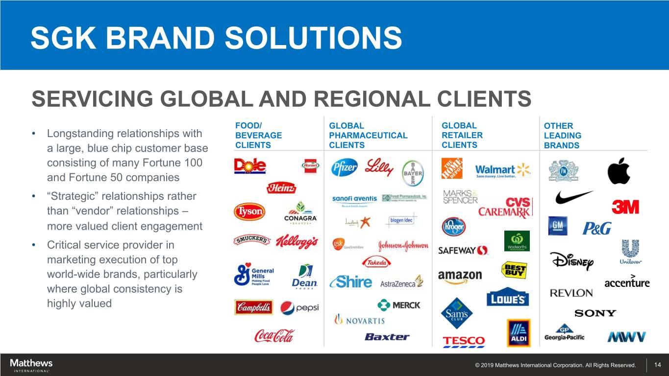 SGK BRAND SOLUTIONS OVERVIEW REVENUES Brand/Marketing Execution Services • Creative Design Tooling • Artwork Production (reprographic / pre-press) Merchandising • Tooling (printing plates) • Merchandising Creative Design FY2018 Financial Results • Sales: $805.3 million • Adjusted EBITDA(1): $150.2 million, 18.7% of sales ~7,000 Employees Artwork Production Leading Global Brands (1) See appendix for Adjusted EBITDA reconciliations and other important disclosures regarding Matthews’ use of Non-GAAP measures © 2019 Matthews International Corporation. All Rights Reserved. 13
