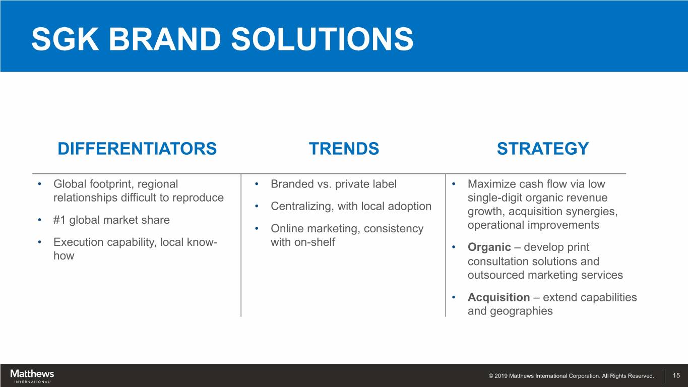 SGK BRAND SOLUTIONS SERVICING GLOBAL AND REGIONAL CLIENTS FOOD/ GLOBAL GLOBAL OTHER • Longstanding relationships with BEVERAGE PHARMACEUTICAL RETAILER LEADING a large, blue chip customer base CLIENTS CLIENTS CLIENTS BRANDS consisting of many Fortune 100 and Fortune 50 companies • “Strategic” relationships rather than “vendor” relationships – more valued client engagement • Critical service provider in marketing execution of top world-wide brands, particularly where global consistency is highly valued © 2019 Matthews International Corporation. All Rights Reserved. 14