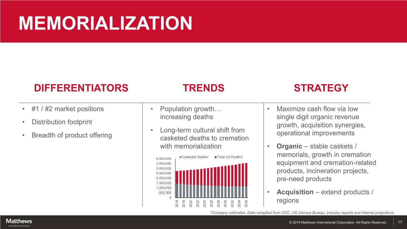 MEMORIALIZATION DIFFERENTIATORS TRENDS STRATEGY • #1 / #2 market positions • Population growth… • Maximize cash flow via low increasing deaths single digit organic revenue • Distribution footprint growth, acquisition synergies, • Long-term cultural shift from operational improvements • Breadth of product offering casketed deaths to cremation with memorialization • Organic – stable caskets / Casketed Deaths* Total US Deaths* memorials, growth in cremation 4, 000,000 3, 500,000 equipment and cremation-related 3, 000,000 2, 500,000 products, incineration projects, 2, 000,000 pre-need products 1, 500,000 1, 000,000 500, 000 • Acquisition – extend products / 0 regions 2016 2018 2020 2022 2024 2026 2028 2030 2032 2034 2036 *Company estimates. Data compiled from CDC, US Census Bureau, Industry reports and internal projections. © 2019 Matthews International Corporation. All Rights Reserved. 17