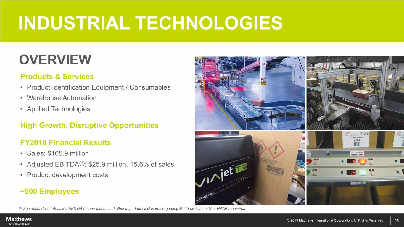 BRIAN DUNN Executive Vice President, Strategy & Corporate INDUSTRIAL Development TECHNOLOGIES PAUL JENSEN Division President, Industrial Technologies © 2019 Matthews International Corporation. All Rights Reserved.