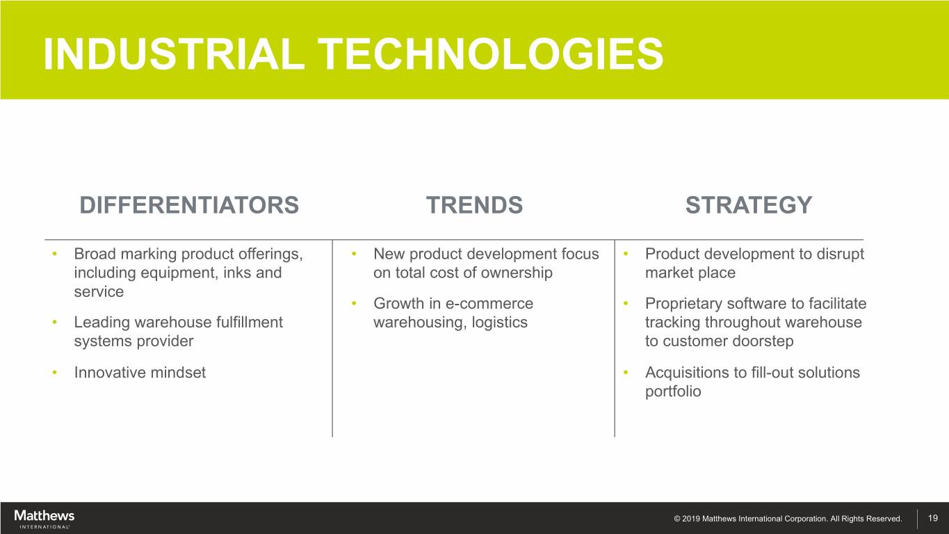 INDUSTRIAL TECHNOLOGIES OVERVIEW Products & Services • Product Identification Equipment / Consumables • Warehouse Automation • Applied Technologies High Growth, Disruptive Opportunities FY2018 Financial Results • Sales: $165.9 million • Adjusted EBITDA(1): $25.9 million, 15.6% of sales • Product development costs ~500 Employees (1) See appendix for Adjusted EBITDA reconciliations and other important disclosures regarding Matthews’ use of Non-GAAP measures © 2019 Matthews International Corporation. All Rights Reserved. 18