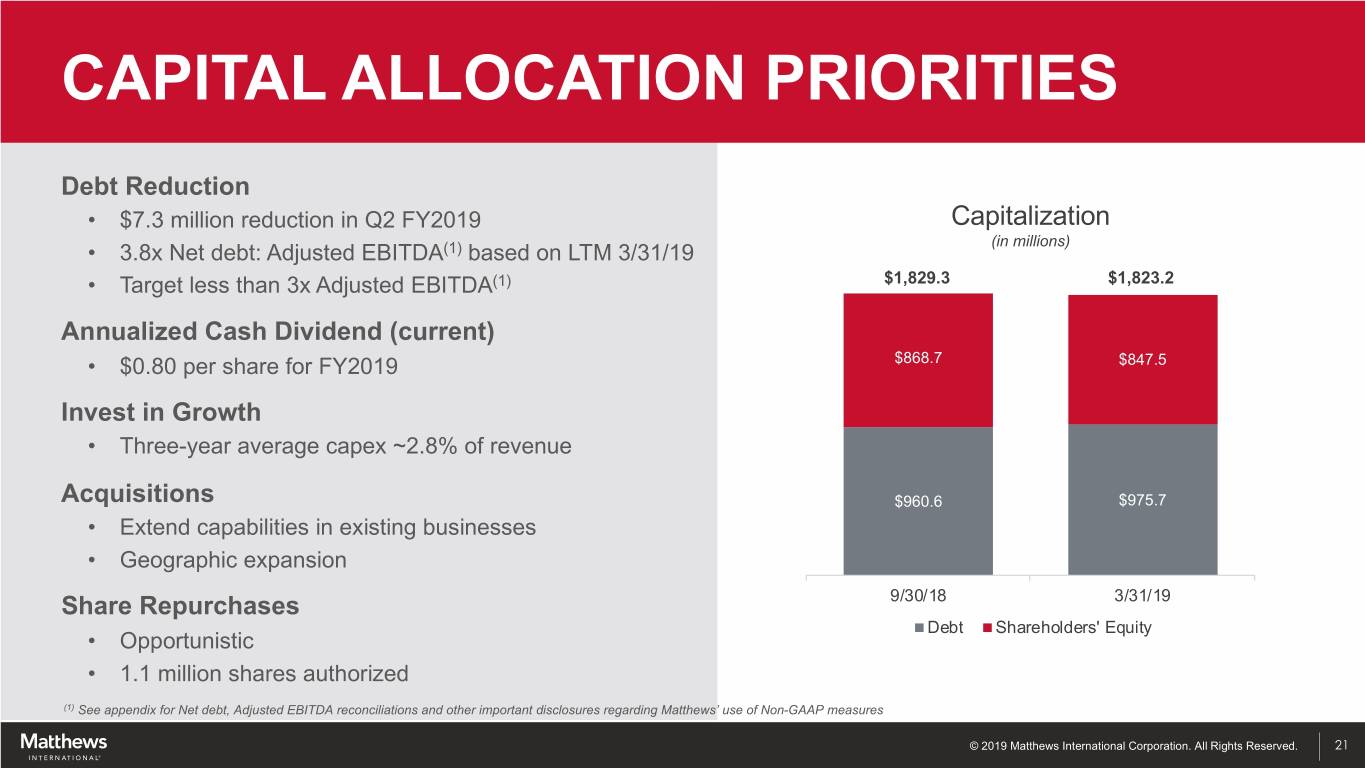 VALUE CREATION ORGANIC • Expanding market penetration with existing products • Synergies and manufacturing / cost structure improvements • New product introductions ACQUISITIONS • Support segment business plans; fill product / geographic gaps • Leverage existing operating infrastructure • Achieve long-term annual return (EBITDA) on invested capital of at least 14% SHARE REPURCHASES • Opportunistic - Repurchase in periods of excess cash flow - Current remaining authorization: 1.1 million shares © 2019 Matthews International Corporation. All Rights Reserved. 20