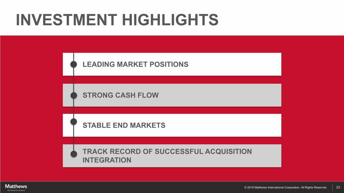 INVESTMENT HIGHLIGHTS LEADING MARKET POSITIONS STRONG CASH FLOW STABLE END MARKETS TRACK RECORD OF SUCCESSFUL ACQUISITION INTEGRATION © 2019 Matthews International Corporation. All Rights Reserved. 22