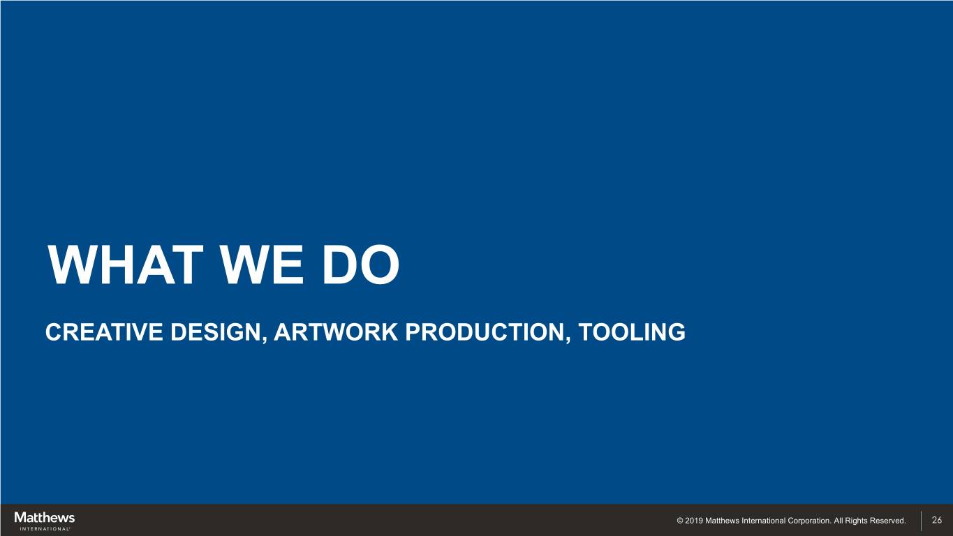 WHAT WE DO CREATIVE DESIGN, ARTWORK PRODUCTION, TOOLING © 2019 Matthews International Corporation. All Rights Reserved. 26